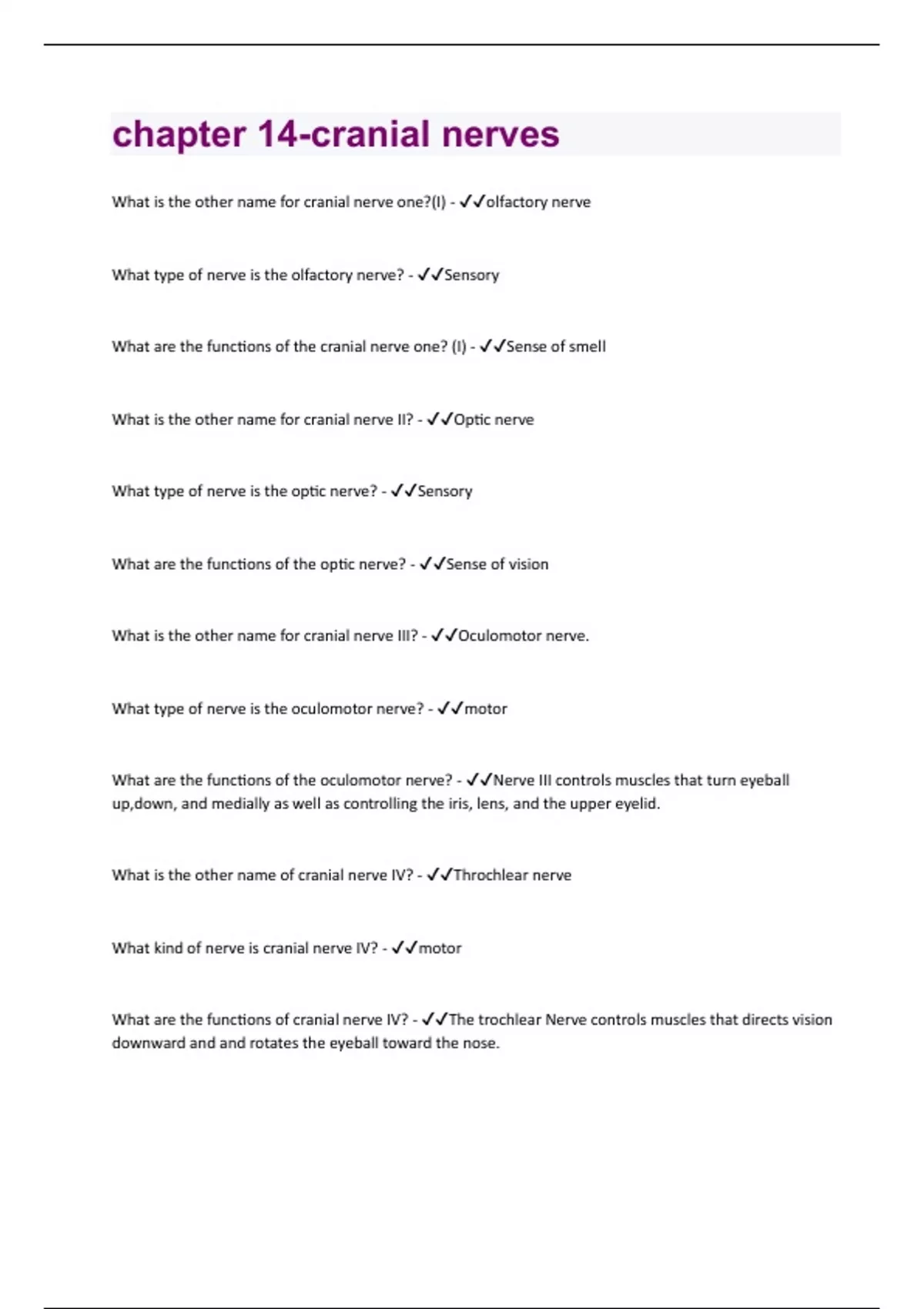 chapter 14-cranial nerves| 41 Questions and Answers (A+ Solution guide)