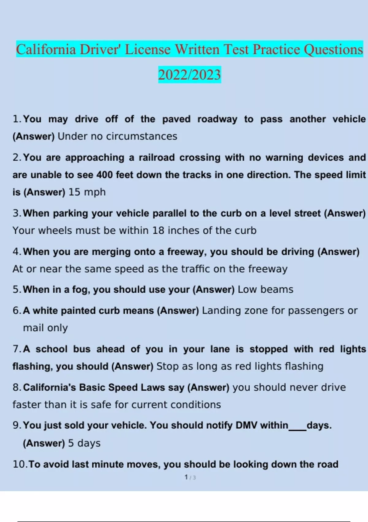 California Driver' License Written Test Practice Questions| questions and answers 2022/2023 verified answers