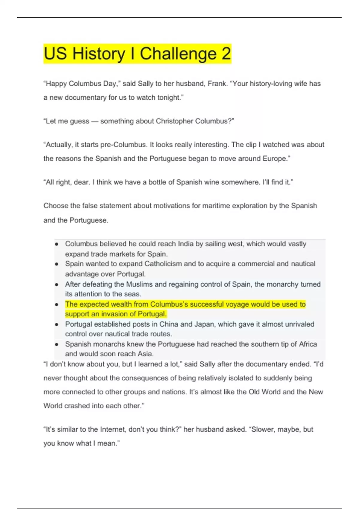 US History I Challenge 2 “Happy Columbus Day,” said Sally to her husband, Frank. “Your history-loving wife has a new documentary for us to watch tonight.” “Let me guess — something about Christopher Columbus?” “Actually, it starts pre-Columbus. It looks really interesting. The clip I watched was about the reasons the Spanish and the Portuguese began to move around Europe.” “All right, dear. I think we have a bottle of Spanish wine somewhere. I’ll find it.” Choose the false statement about motivations for maritime exploration by the Spanish and the Portuguese. • Columbus believed he could reach India by sailing west, which would vastly expand trade markets for Spain. • Spain wanted to expand Catholicism and to acquire a commercial and nautical advantage over Portugal. • After defeating the Muslims and regaining control of Spain, the monarchy turned its attention to the seas. • The expected wealth from Columbus’s successful voyage would be used to support an invasion of Portugal. • Portugal established posts in China and Japan, which gave it almost unrivaled control over nautical trade routes. • Spanish monarchs knew the Portuguese had reached the southern tip of Africa and would soon reach Asia. “I don’t know about you, but I learned a lot,” said Sally after the documentary ended. “I’d never thought about the consequences of being relatively isolated to suddenly being more connected to other groups and nations. It’s almost like the Old World and the New World crashed into each other.” “It’s similar to the Internet, don’t you think?” her husband asked. “Slower, maybe, but you know what I mean.” “Sure. They even called it globalization in the film.” Categorize the statements as reflecting "globalization," "colonization," or "commodification." = Correct Answer = Incorrect Answer globalization colonization commodificatio n This process increased the interconnectedn ess of the world. ● Promoters of this claimed the Americas held a wealth of treasures ready for the taking. ● This transformed New World resources into products that could be bought and sold. ● “Oh, and the part about the Columbian Exchange,” said Frank “With Europeans crossing the Atlantic and all those things going back and forth, so many lives and landscapes changed on both sides of the ocean. That was fascinating, wasn’t it?” Sally nodded in agreement. Choose two statements that do NOT reflect an impact of the Columbian Exchange for Europe and the New World. “I’ve been doing some research,” said Sally casually, a couple of days later. “Oh yeah? What’s caught your interest this time?” “It was that documentary we watched the other night, the one about Christopher Columbus, remember?” At Frank’s nod, Sally went on. “I hadn’t known how the Spanish treated native tribes they encountered in the New World, so I thought I’d look into it some more.” “Find anything interesting?”