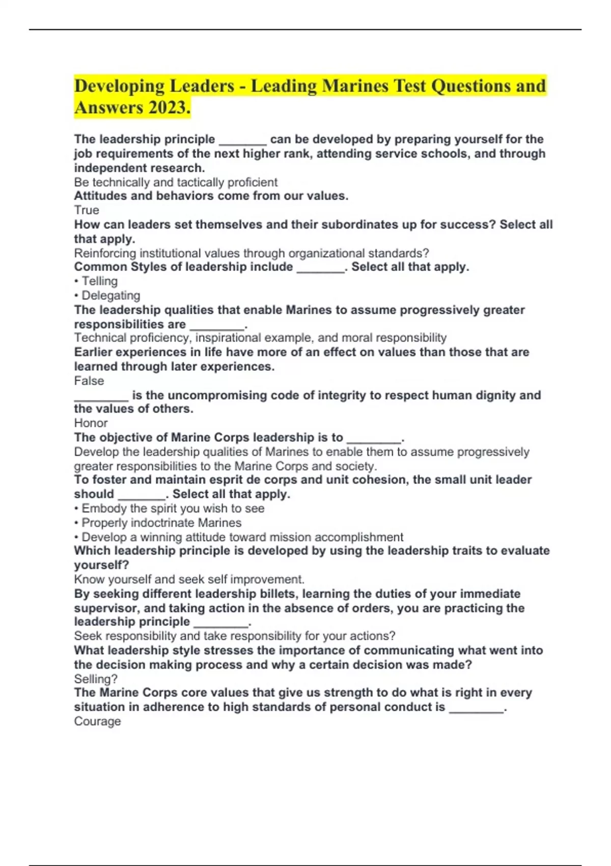 Developing Leaders - Leading Marines Test Questions and Answers 2023.