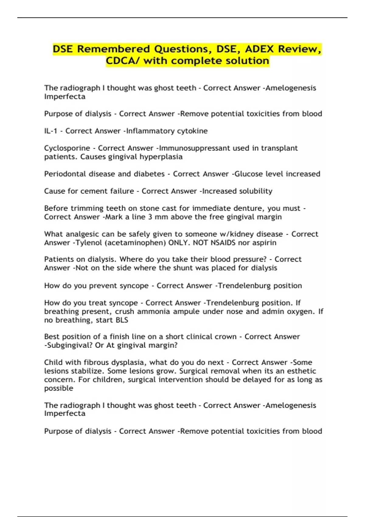 NUR 220 DSE Remembered Questions, DSE, ADEX Review, CDCA/ with complete solution | The radiograph I thought was ghost teeth - Correct Answer -Amelogenesis Imperfecta Purpose of dialysis -..