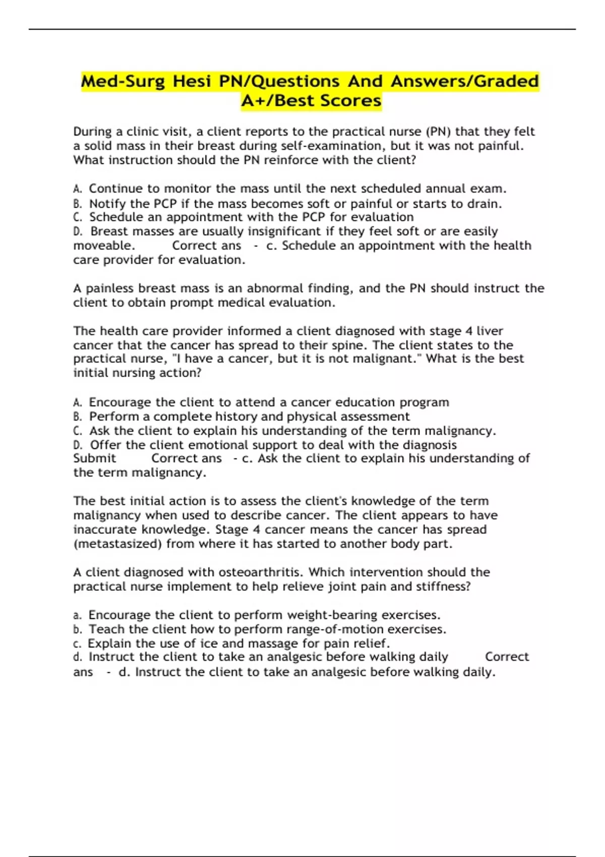 Med-Surg Hesi PN/Questions And Answers/Graded A+/Best Scores Med-Surg Hesi PN/Questions And Answers/Graded A+/Best Scores During a clinic visit, a client reports to the practical nurse (PN) that they felt a solid mass in their breast during self-examination, but it was not painful. What instruction should the PN reinforce with the client?....