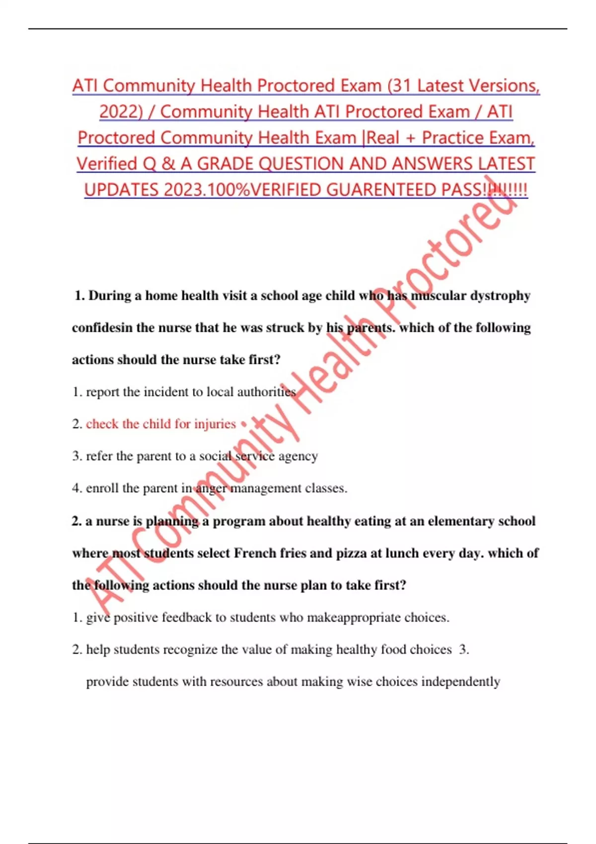 ATI Community Health Proctored Exam (31 Latest Versions, 2022) / Community Health ATI Proctored Exam / ATI Proctored Community Health Exam |Real + Practice Exam, Verified Q & A GRADE QUESTION AND ANSWERS LATEST UPDATES 2023.100%