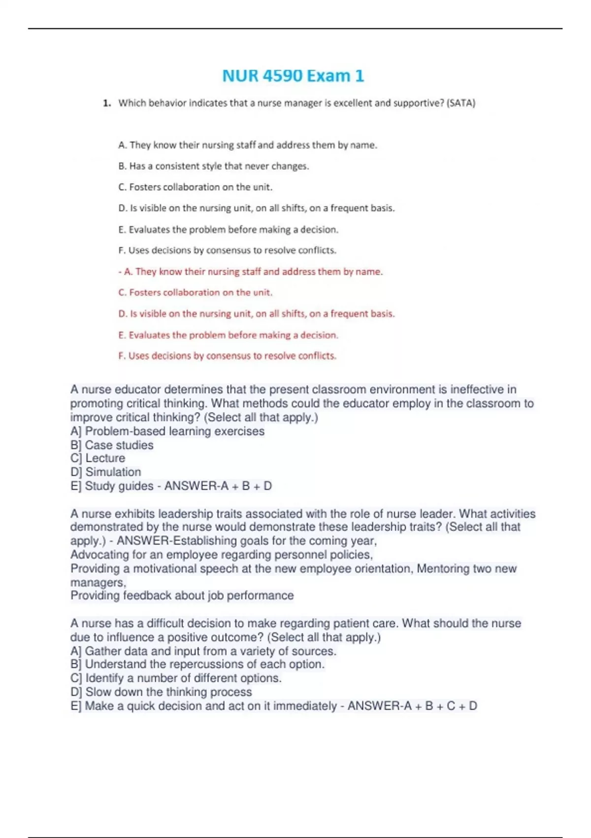 NUR4590 LATEST EXAM WITH QUESTION AND ANSWER LATEST 2023