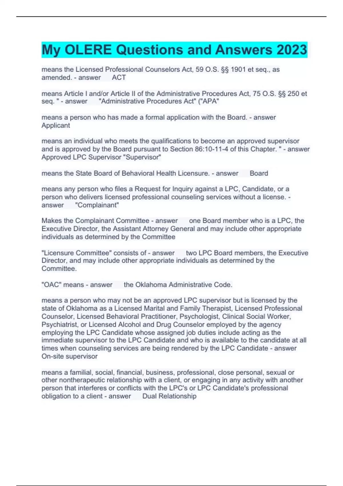 My OLERE Questions and Answers 2023 means the Licensed Professional Counselors Act, 59 O.S. §§ 1901 et seq., as amended. ACT means Article I and/or Article II of the Administrative Procedures Act, 75 O.S. §§ 250 et seq. " "Administrative Procedures Act" ("APA" means a person who has made a formal application with the Board. Applicant means an individual who meets the qualifications to become an approved supervisor and is approved by the Board pursuant to Section 86:10-11-4 of this Chapter. " Approved LPC Supervisor "Supervisor" means the State Board of Behavioral Health Licensure. Board means any person who files a Request for Inquiry against a LPC, Candidate, or a person who delivers licensed professional counseling services without a license. "Complainant" Makes the Complainant Committee one Board member who is a LPC, the Executive Director, the Assistant Attorney General and may include other appropriate individuals as determined by the Committee "Licensure Committee" consists of two LPC Board members, the Executive Director, and may include other appropriate individuals as determined by the Committee. "OAC" means the Oklahoma Administrative Code. means a person who may not be an approved LPC supervisor but is licensed by the state of Oklahoma as a Licensed Marital and Family Therapist, Licensed Professional Counselor, Licensed Behavioral Practitioner, Psychologist, Clinical Social Worker, Psychiatrist, or Licensed Alcohol and Drug Counselor employed by the agency employing the LPC Candidate whose assigned job duties include acting as the immediate supervisor to the LPC Candidate and who is available to the candidate at all times when counseling services are being rendered by the LPC Candidate On-site supervisor means a familial, social, financial, business, professional, close personal, sexual or other nontherapeutic relationship with a client, or engaging in any activity with another person that interferes or conflicts with the LPC's or LPC Candidate's professional obligation to a client Dual Relationship means the performance of therapeutic or clinical functions that includes diagnosis, assessment and treatment of mental, emotional and behavioral disorders based primarily on verbal communications and intervention with, and in the presence of, one or more clients Direct Client Contact Hours ] Any officer of a corporation Employee Any individual who, under the usual common law rules applicable in determining the employer-employee relationship, has the status of Employee means the Supervisor and the Candidate shall be in the physical presence of the other during individual or group supervision. Face-to-face supervision means the application of knowledge, training and experience from the mental health field to the establishment of facts and/or the establishment of evidence in a court of law or ordered by a court of law. Forensic services means a written statement of alleged violation(s) of the Act and/or Rules which is filed by the Assistant Attorney General Formal Complaint "Full time" means at least _______ hours of on-the-job experience per week. 20 "Group supervision" means an assemblage of ___ to ___ Candidates. 2;6 means the delivery of graduate coursework or continuing education through mailed correspondence or other distance learning technologies, which focuses on using synchronous or asynchronous instructional delivery methods. It is designed to deliver education to learners who are not in the direct physical presence of the educator. Home-study or technology-assisted distance learning means a person holding a current license issued pursuant to the provision of the Professional Counselor Licensure Act. Licensed Professional Counselor (LPC) means a person whose application for licensure has been accepted and who is under supervision for licensure as provided in 59 O.S. Licensed Professional Counselor Candidate (Candidate) means a written or oral statement of complaint from any person alleging possible violation(s) of the Act and/or Rules. "Request for Inquiry" ("RFI") means the person against whom an Individual Proceeding is initiated. Respondent means the personnel of the Board Staff refers to supervision that occurs through video teleconferencing, over secure internet connections, wherein a Supervisor and a Candidate are in separate physical locations. Technology-assisted supervision LPCs shall maintain verifiable, accurate and truthful records necessary for rendering professional services to their clients for at least ______ years beyond termination of services 5 LPCs shall maintain the confidentiality of any information received from any person or source about a client, unless authorized in writing by the client or otherwise authorized or required by law or court order LPCs shall be responsible for complying with the applicable state and federal regulations in regard to the security, safety and confidentiality of any counseling record they create, maintain, transfer, or destroy whether the record is written, taped, computerized, or stored in any other medium. LPCs shall provide the client with a copy of the client's record in accordance with state and federal laws. In situations involving multiple clients, access to records is limited to those parts of records that do not include confidential information related to another client LPCs shall not knowingly enter into a dual relationship(s) and shall take any necessary precautions to ____________ a dual relationship from occurring Prevent When the LPC reasonably suspects that he or she has inadvertently entered into a dual relationship the LPC shall: record that fact in the records of the affected client(s) and take reasonable steps to eliminate the source or agent creating or causing the dual relationship. If the dual relationship cannot be prevented or eliminated and the LPC cannot readily refer the client to another counselor or other professional, the LPC shall complete one or more of the following measures as necessar