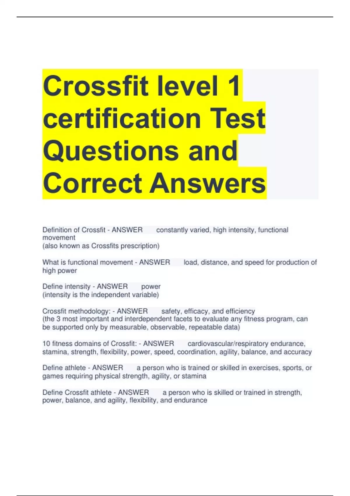 Crossfit level 1 certification Test Questions and Correct Answers