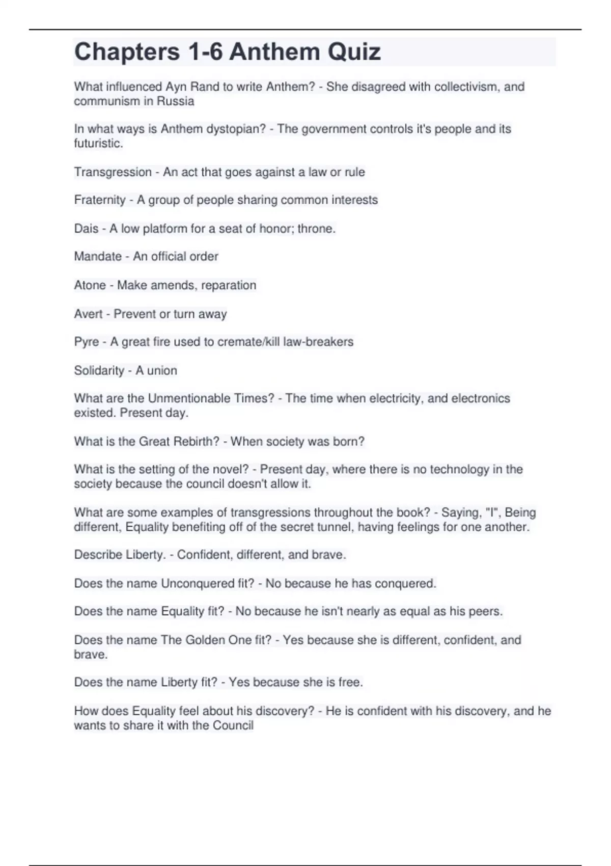 Chapters 1-6 Anthem Quiz.