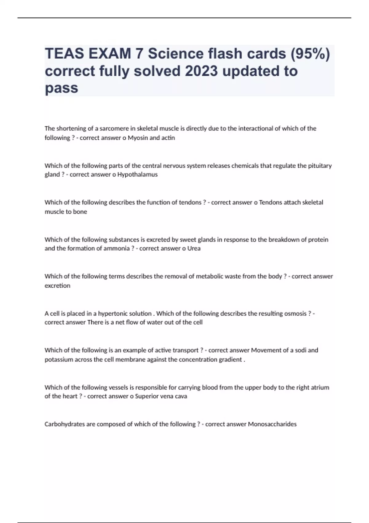 TEAS EXAM 7 Science flash cards (95%) correct fully solved 2023 updated to passThe shortening of a sarcomere in skeletal muscle is directly due to the interactional of which of the following ? - correct answer o Myosin and actin Which of the following parts of the central nervous system releases chemicals that regulate the pituitary gland ? - correct answer o Hypothalamus Which of the following describes the function of tendons ? - correct answer o Tendons attach skeletal muscle to bone Which of the following substances is excreted by sweet glands in response to the breakdown of protein and the formation of ammonia ? - correct answer o Urea Which of the following terms describes the removal of metabolic waste from the body ? - correct answer excretion A cell is placed in a hypertonic solution . Which of the following describes the resulting osmosis ? - correct answer There is a net flow of water out of the cell Which of the following is an example of active transport ? - correct answer Movement of a sodi and potassium across the cell membrane against the concentration gradient . Which of the following vessels is responsible for carrying blood from the upper body to the right atrium of the heart ? - correct answer o Superior vena cava Carbohydrates are composed of which of the following ? - correct answer Monosaccharides
