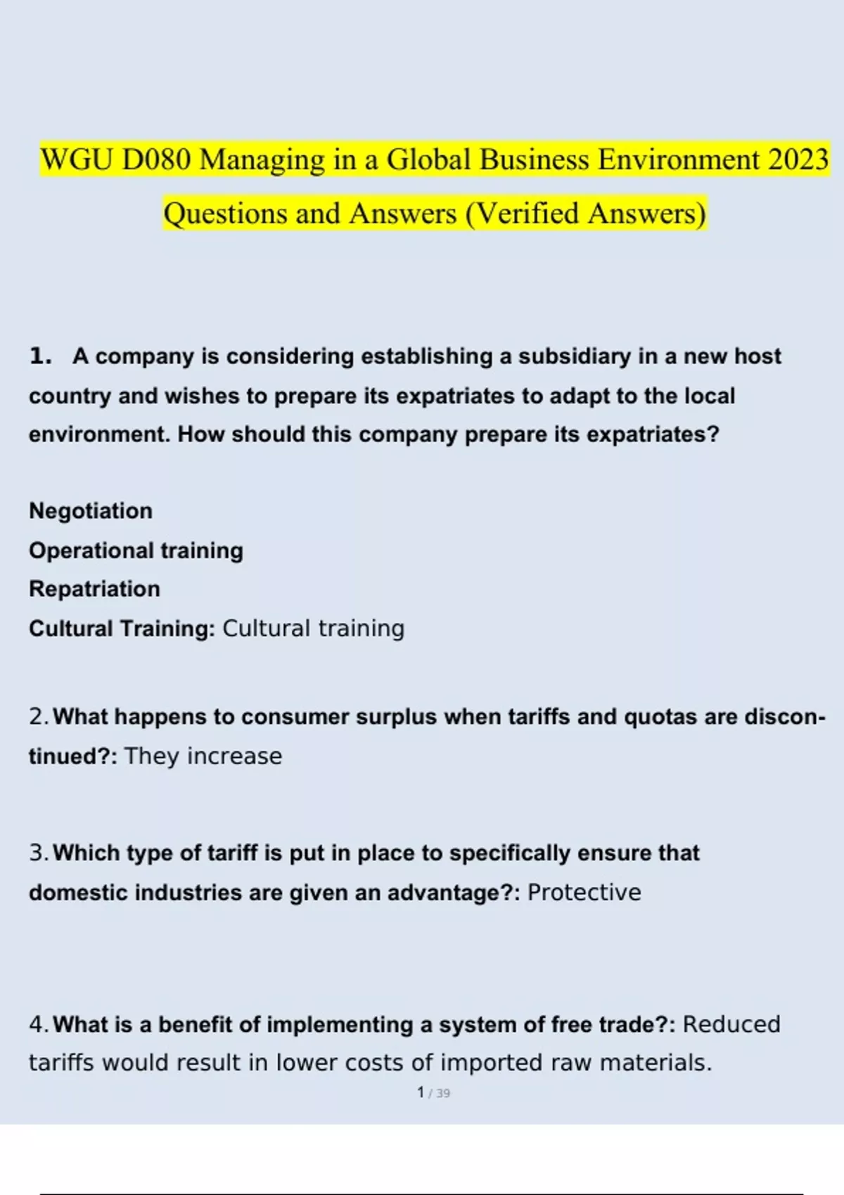 WGU D080 Managing in a Global Business Environment 2023 Questions and Answers (Verified Answers) WGU D080 Managing in a Global Business Environment 2023 Questions and Answers (Verified Answers)
