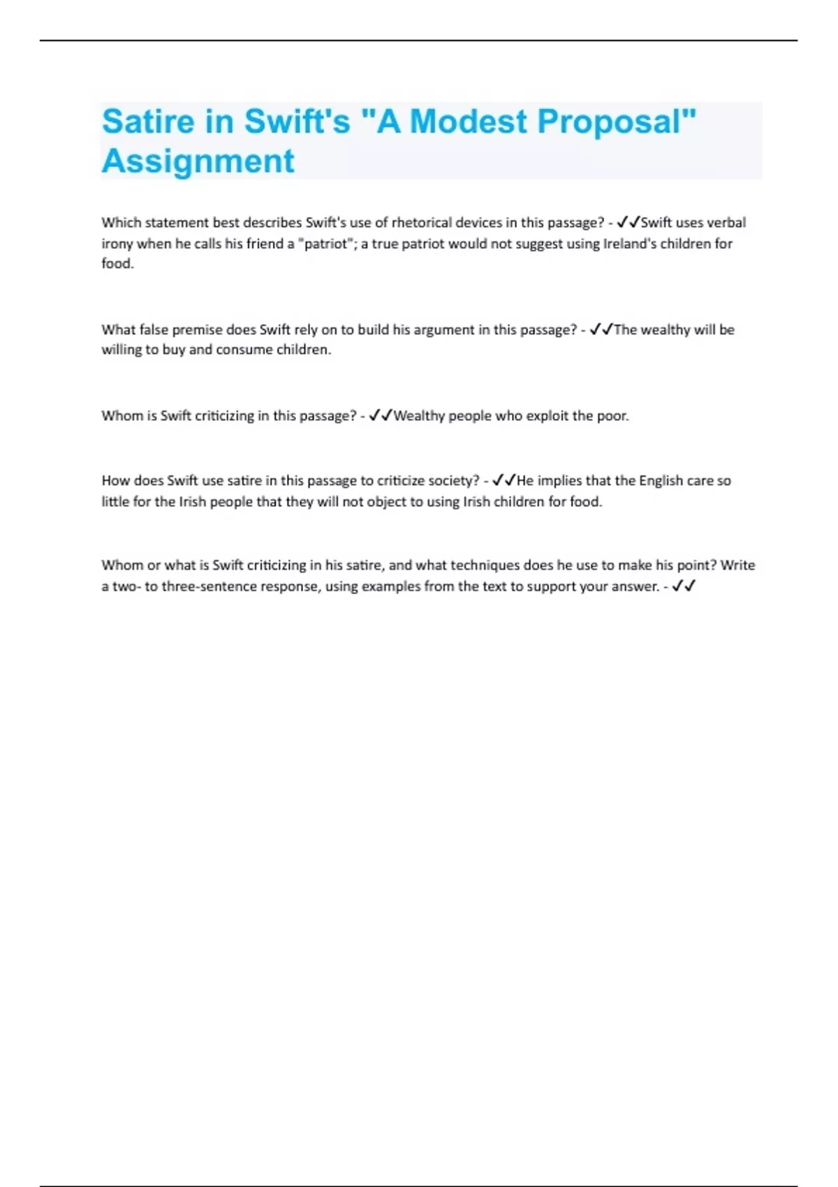 Satire in Swift's "A Modest Proposal" Assignment Question and Answers (A+ guide solution)