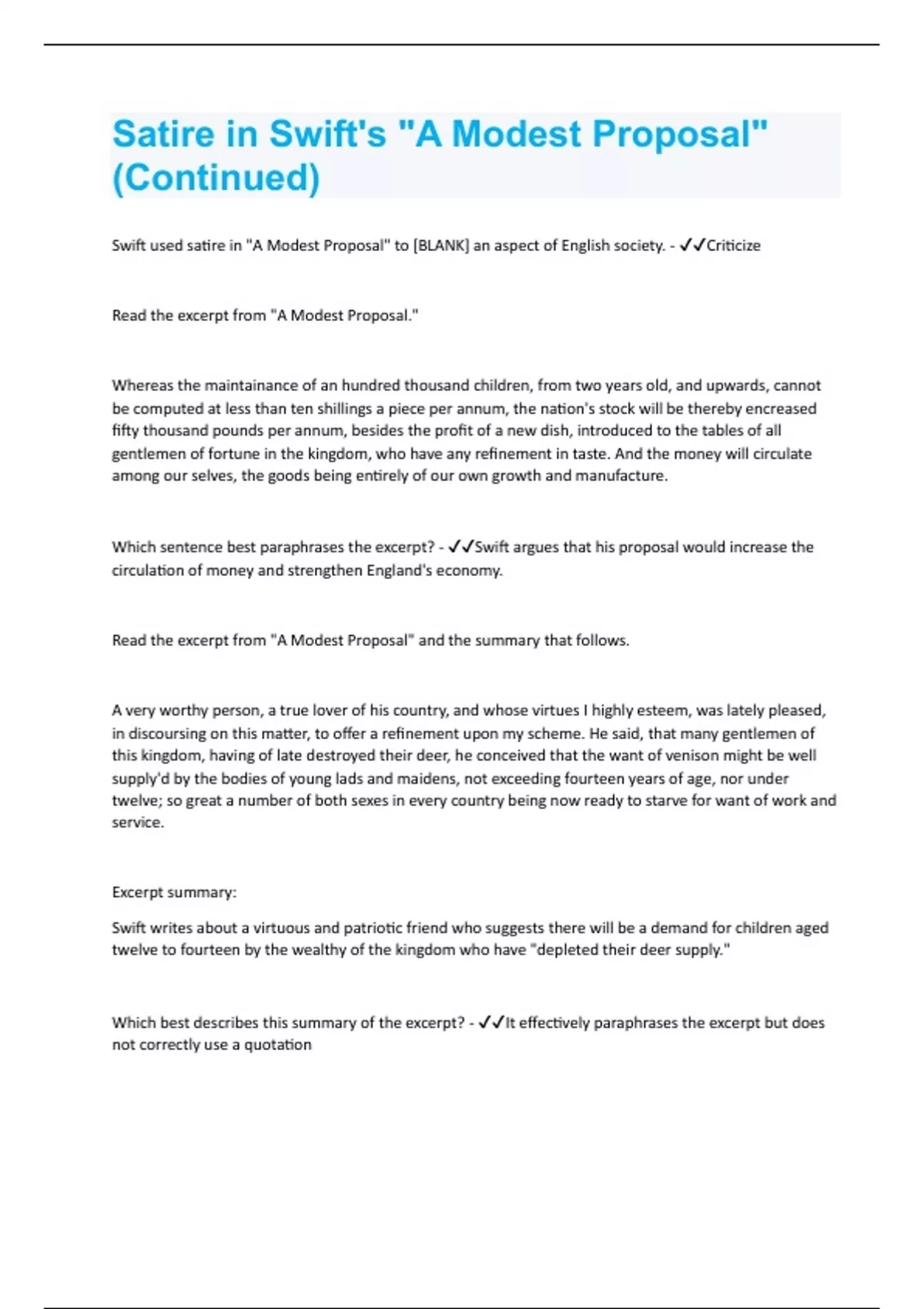 wift used satire in "A Modest Proposal" to [BLANK] an aspect of English society. - Criticize Read the excerpt from "A Modest Proposal." Whereas the maintainance of an hundred thousand children, from two years old, and upwards, cannot be computed at less than ten shillings a piece per annum, the nation's stock will be thereby encreased fifty thousand pounds per annum, besides the profit of a new dish, introduced to the tables of all gentlemen of fortune in the kingdom, who have any refinement in taste. And the money will circulate among our selves, the goods being entirely of our own growth and manufacture. Which sentence best paraphrases the excerpt? - Swift argues that his proposal would increase the circulation of money and strengthen England's economy. Read the excerpt from "A Modest Proposal" and the summary that follows. A very worthy person, a true lover of his country, and whose virtues I highly esteem, was lately pleased, in discoursing on this matter, to offer a refinement upon my scheme. He said, that many gentlemen of this kingdom, having of late destroyed their deer, he conceived that the want of venison might be well supply'd by the bodies of young lads and maidens, not exceeding fourteen years of age, nor under twelve; so great a number of both sexes in every country being now ready to starve for want of work and service. Excerpt summary: Swift writes about a virtuous and patriotic friend who suggests there will be a demand for children aged twelve to fourteen by the wealthy of the kingdom who have "depleted their deer supply." Which best describes this summary of the excerpt? - It effectively paraphrases the excerpt but does not correctly use a quotationRead the statem