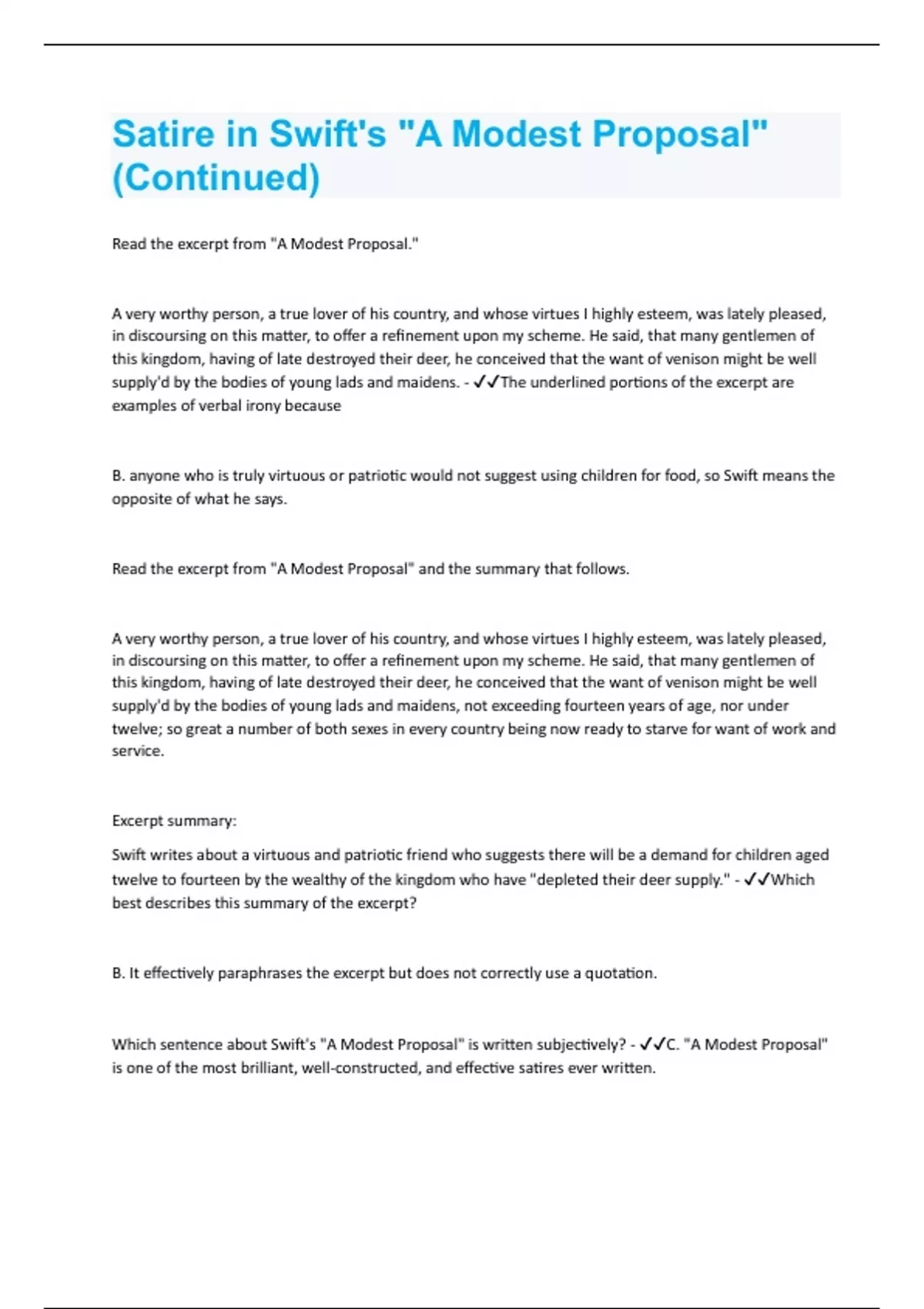A very worthy person, a true lover of his country, and whose virtues I highly esteem, was lately pleased, in discoursing on this matter, to offer a refinement upon my scheme. He said, that many gentlemen of this kingdom, having of late destroyed their deer, he conceived that the want of venison might be well supply'd by the bodies of young lads and maidens. - The underlined portions of the excerpt are examples of verbal irony because B. anyone who is truly virtuous or patriotic would not suggest using children for food, so Swift means the opposite of what he says. Read the excerpt from "A Modest Proposal" and the summary that follows. A very worthy person, a true lover of his country, and whose virtues I highly esteem, was lately pleased, in discoursing on this matter, to offer a refinement upon my scheme. He said, that many gentlemen of this kingdom, having of late destroyed their deer, he conceived that the want of venison might be well supply'd by the bodies of young lads and maidens, not exceeding fourteen years of age, nor under twelve; so great a number of both sexes in every country being now ready to starve for want of work and service. Excerpt summary: Swift writes about a virtuous and patriotic friend who suggests there will be a demand for children aged twelve to fourteen by the wealthy of the kingdom who have "depleted their deer supply." - Which best describes this summary of the excerpt? B. It effectively paraphrases the excerpt but does not correctly use a quotation. Which sentence about Swift's "A Modest Proposal" is written subjectively? - C. "A Modest Proposal" is one of the most brilliant, well-constructed, and effective satires ever written.