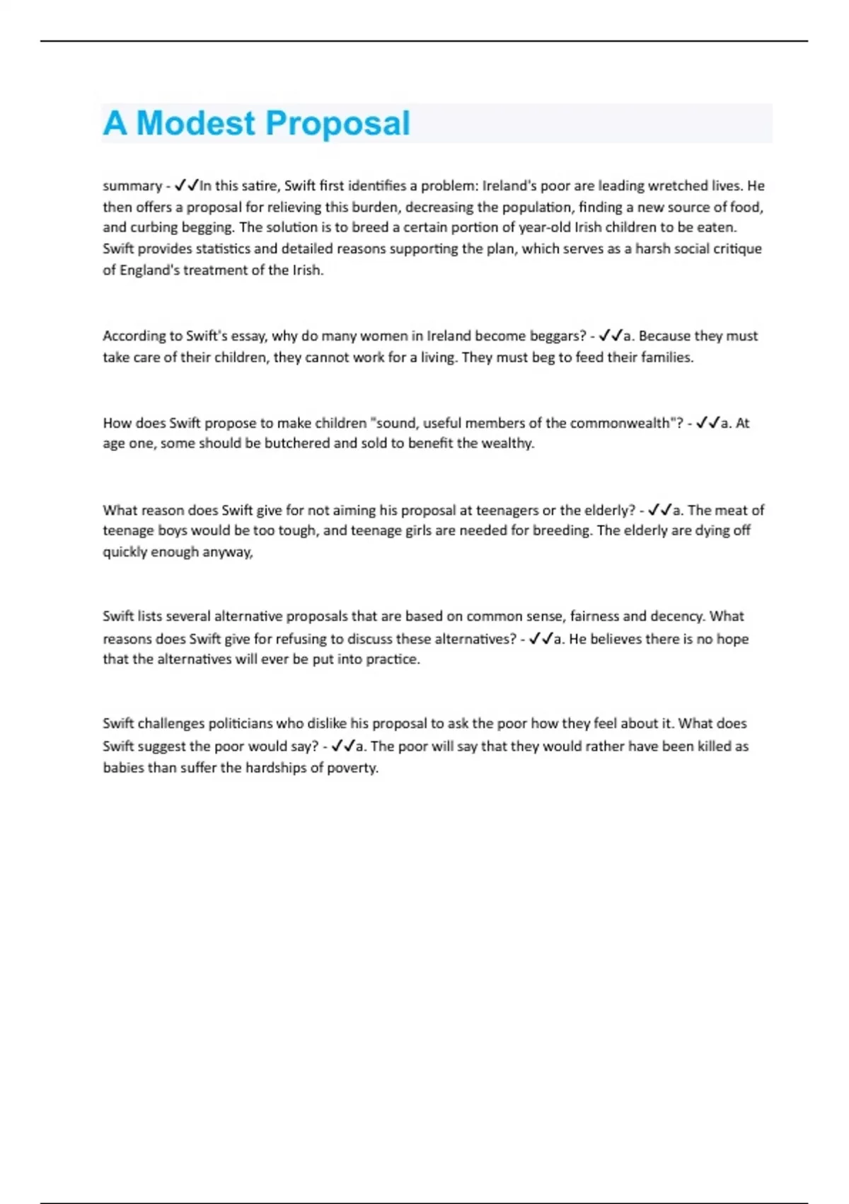 summary - In this satire, Swift first identifies a problem: Ireland's poor are leading wretched lives. He then offers a proposal for relieving this burden, decreasing the population, finding a new source of food, and curbing begging. The solution is to breed a certain portion of year-old Irish children to be eaten. Swift provides statistics and detailed reasons supporting the plan, which serves as a harsh social critique of England's treatment of the Irish. According to Swift's essay, why do many women in Ireland become beggars? - a. Because they must take care of their children, they cannot work for a living. They must beg to feed their families. How does Swift propose to make children "sound, useful members of the commonwealth"? - a. At age one, some should be butchered and sold to benefit the wealthy. What reason does Swift give for not aiming his proposal at teenagers or the elderly? - a. The meat of teenage boys would be too tough, and teenage girls are needed for breeding. The elderly are dying off quickly enough anyway, Swift lists several alternative proposals that are based on common sense, fairness and decency. What reasons does Swift give for refusing to discuss these alternatives? - a. He believes there is no hope that the alternatives will ever be put into practice. Swift challenges politicians who dislike his proposal to ask the poor how they feel about it. What does Swift suggest the poor would say? - a. The poor will say that they would rather have been killed as babies than suffer the hardships of poverty