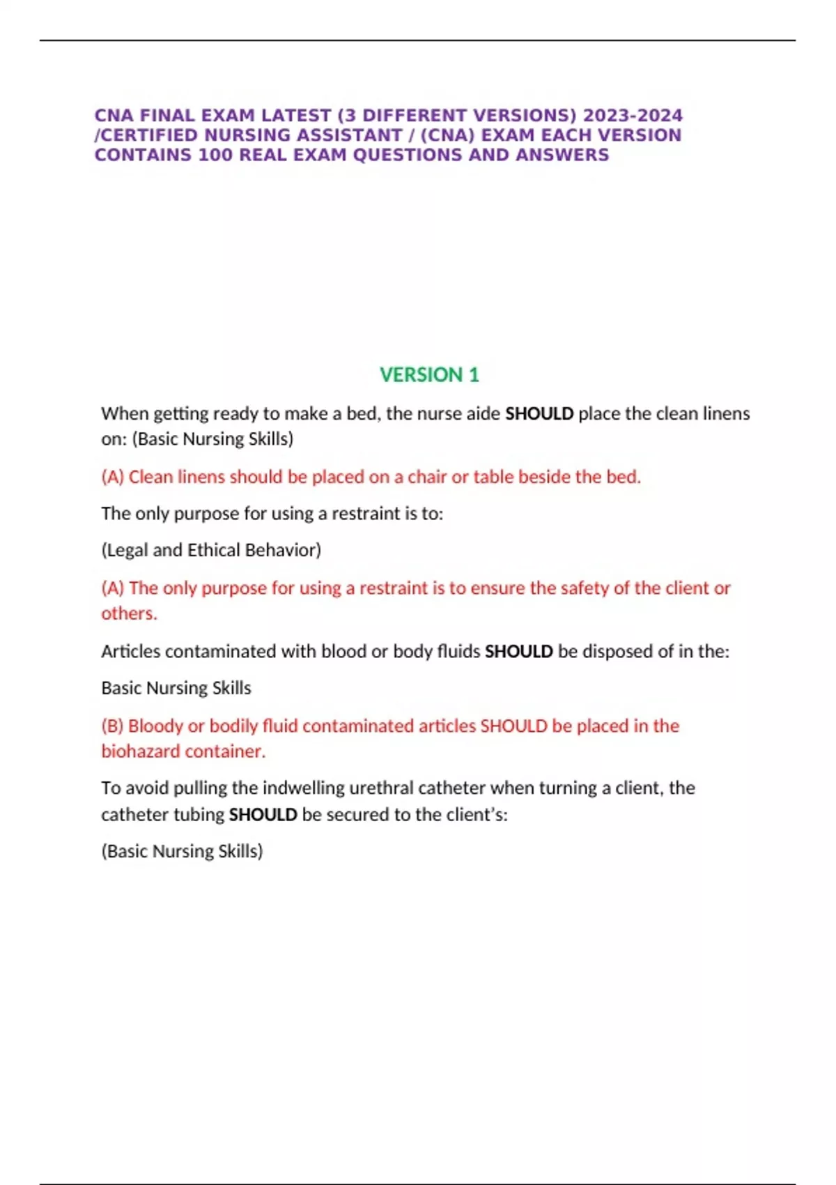 CNA FINAL EXAM LATEST (3 DIFFERENT VERSIONS) /CERTIFIED NURSING ASSISTANT / (CNA) EXAM EACH VERSION CONTAINS 100 REAL EXAM QUESTIONS AND ANSWERS