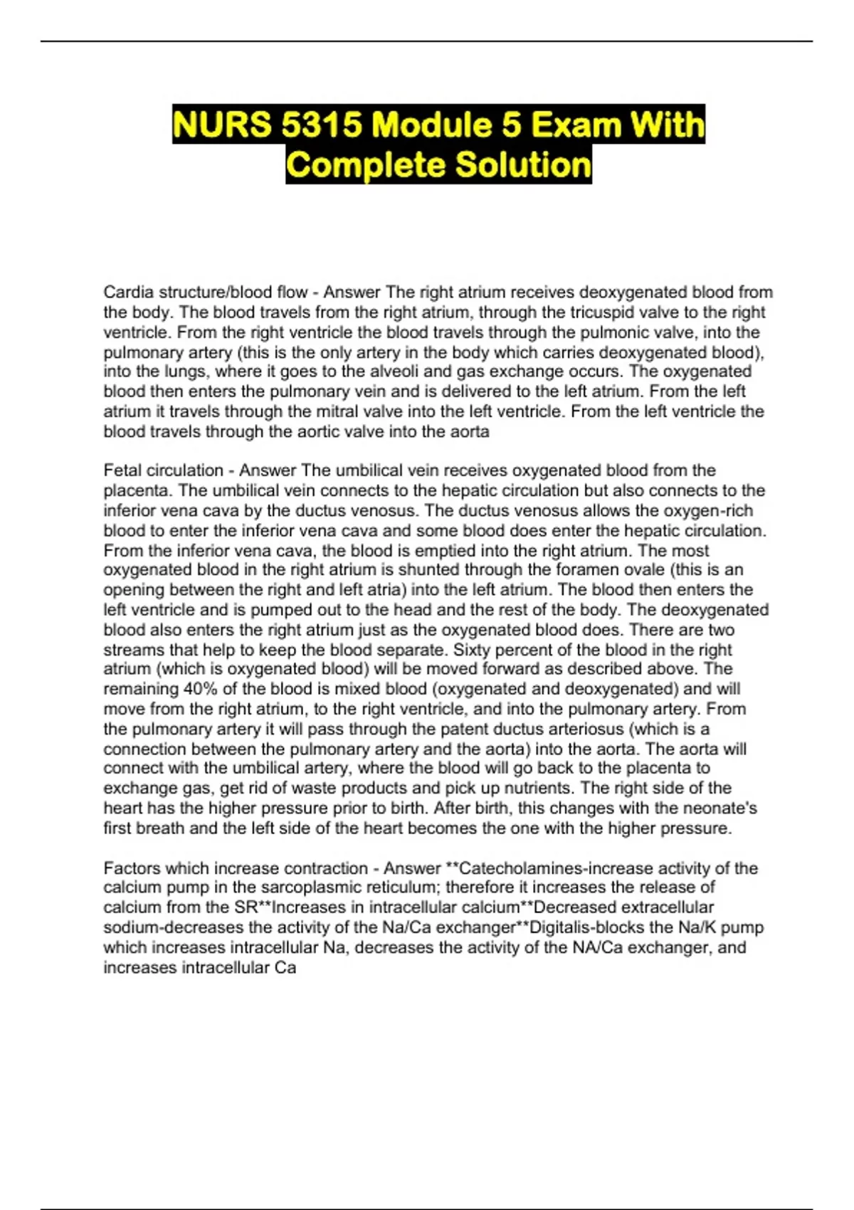 NUR S 5315 M odule 5 Exam W ith Comp lete Solution Cardia structure/blood flow - Answer The right atrium receives deoxygenated blood f rom the body. The blood travels from the right atrium, through the tricuspid va lve to the right ventricle. From the right ventricle the blood travels through the pulmonic valve, into th e pulmonary artery (this is the only artery in the body which carries deoxygenated blood), into the lungs, where it goes to the alveoli and gas exchange occurs. The oxygen ated blood then enters the pulmonary vein and is delivered to the left atrium. From the left atrium it travels through the mitral valve into the left ventricle. From the left ventricle the blood travels through the aortic valve into the aorta Fetal circulation - Answer The umbilical vein receives oxygenated blood from the placenta. The umbilical vein connects to the hepatic circulation but also connects to th e inferior vena cava by the ductus venosus. The ductus venosus allows the oxygen- rich blood to enter the inferior vena cava and some blood does enter the hepatic circu lation. From the inferior vena cava, the blood is emptied into the right atrium. The mo st oxygenated blood in the right atrium is shunted through the foramen ovale (this is an opening between the right and left atria) into the left atrium. The blood then enters the left ventricle and is pumped out to the head and the rest of the body. The deoxygenated blood also enters the right atrium just as the oxygenated blood does. There are two streams that help to keep the blood separate. Sixty percent of the blood in the ri ght atrium (which is oxygenated blood) will be moved forward as described above. The remaining 40% of the blood is mixed blood (oxygenated and deoxygenated) and will move from the right atrium, to the right ventricle, and into the pulmonary a rtery. From the pulmonary artery it will pass through the patent ductus arteriosus (which is a connection between the pulmonary artery and the aorta) into the aorta. The a orta will connect with the umbilical artery, where the blood will go back to the placenta to exchange gas, get rid of waste products and pick up nutrients. The right side of the heart has the higher pressure prior to birth. After birth, this changes with the neona te's first breath and the left side of the heart becomes the one with the higher pressu re. Factors which increase contraction - Answer **Catecholamines-increase activity of the calcium pump in the sarcoplasmic reticulum; therefore it increases the release of calcium from the SR**Increases in intracellular calcium**Decreased extracellular sodium-decreases the activity of the Na/Ca exchanger**Digitalis-blocks the Na/K pump which increases intracellular Na, decreases the activity of the NA/Ca exchanger, and increases intracellular Ca Factors which decrease contraction - Answer **Beta blockers-block the effects of the catecholamines**heart failure with systolic dysfunction**acidosis**hypoxia/hypercapnia **nondihydropyridine calcium channel blockers Cardiac output (CO) - Answer Amount of blood pushed from the left ventricle in 1 minutes. HR X STROKE VOLUME = CO. Normal output is 5L/minute Stroke Volume - Answer Amount of blood ejected by the ventricle for each cardiac cycle. Highly dependent on the force of contraction. Contraction is dependent upon amount of preload, stimulation by endogenous positive inotropic agents such as epi and norepi, presence of negative inotropic agents and adequacy of myocardial oxygenatio n Ejection fraction (EF) - Answer Percentage of blood which is ejected from the ventricle with each contraction. Calculated by dividing the stroke volume by the end diastolic volume. Normal EF is 55-65%. EF decreases with systolic heart failure but not in diastolic heart failure Preload - Answer Made up of end diastolic volume and end diastolic pressure. Dependent upon the amount of venous return to the heart and the amoun t of blood left in the left ventricle at the end of systole. Increased preload can cause heart failu re from a decline in stroke volume and a back up into pulmonary circulation Afterload - Answer Resistance that the ventricle pushes against to contract. This includes aortic pressure and systemic vascular resistance. High afterload increases the work of the ventricle and results in hypertrophy. A low afterload enables the hea rt to contract faster Diltiazem and verapamil - Answer non-dihydropyridine calcium channel blockers. They inhibit the influx of calcium into the myocardium. This decreases intracellular calcium concentration which in turn decreases myocardial tension and contractility. They have negative inotropic effects. As such these medications should be avoided in persons with systolic heart failure. Dobuamine - Answer Stimulates the beta 1 receptors in the myocardium and improv es contractility and increases heart rate Epinephrine - Answer Primarily stimulates beta 1 receptors of the heart which results in an increase in myocardial contractility and heart rate. Also effects beta 2 and alpha 1 receptors which cancel each other out and does not change vascular tone. In high doses alpha 1 overrides beta 2 which causes vasocontriction and increased systemic vascular resistance while still enhancing contractility and cardiac output Norepinephrine - Answer Stimulates both beta 1 and alpha 1 receptors. This incrases myocardial contractility and causes vasoconstriction. Result in increase in cardiac output and blood pressure