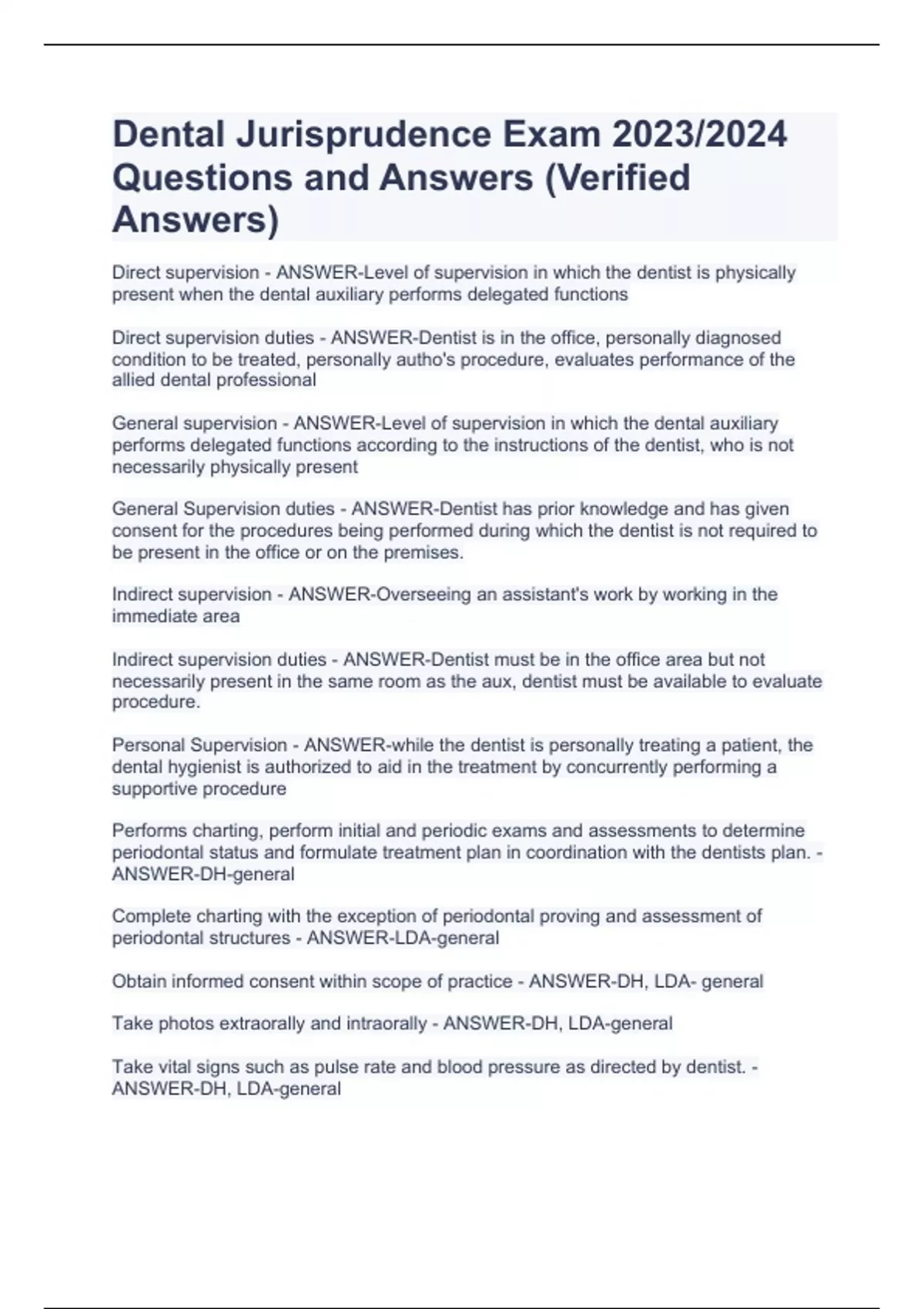 Dental Jurisprudence Exam 2023/2024 Questions and Answers (Verified Answers) Dental Jurisprudence Exam 2023/2024 Questions and Answers (Verified Answers) Dental Jurisprudence Exam 2023/2024 Questions and Answers (Verified Answers) Dental Jurisprudence Exam 2023/2024 Questions and Answers (Verified Answers) Dental Jurisprudence Exam 2023/2024 Questions and Answers (Verified Answers) Dental Jurisprudence Exam 2023/2024 Questions and Answers (Verified Answers) Direct supervision - ANSWER-Level of supervision in which the dentist is physically present when the dental auxiliary performs delegated functions Direct supervision duties - ANSWER-Dentist is in the office, personally diagnosed condition to be treated, personally autho's procedure, evaluates performance of the allied dental professional General supervision - ANSWER-Level of supervision in which the dental auxiliary performs delegated functions according to the instructions of the dentist, who is not necessarily physically present General Supervision duties - ANSWER-Dentist has prior knowledge and has given consent for the procedures being performed during which the dentist is not required to be present in the office or on the premises. Indirect supervision - ANSWER-Overseeing an assistant's work by working in the immediate area Indirect supervision duties - ANSWER-Dentist must be in the office area but not necessarily present in the same room as the aux, dentist must be available to evaluate procedure. Personal Supervision - ANSWER-while the dentist is personally treating a patient, the dental hygienist is authorized to aid in the treatment by concurrently performing a supportive procedure Performs charting, perform initial and periodic exams and assessments to determine periodontal status and formulate treatment plan in coordination with the dentists plan. - ANSWER-DH-general