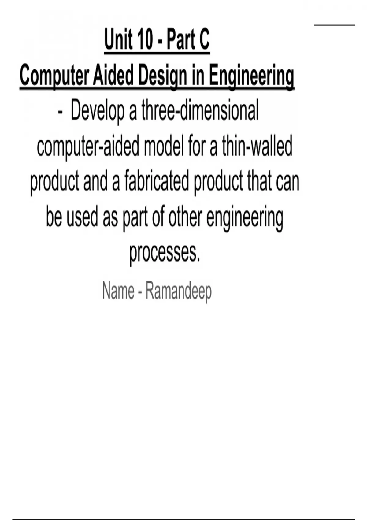 Engineering Unit 10 :Computer Aided Design in Engineering: Learning Aim C. The document includes a coursework that was submitted in 2021/23. The model that I did for this was a VOLTMETER (which might be different to yours). The overall unit received a high distinction grade, meaning that you can use it as a reference and a guide in order to have your own high quality work, and ensure that there are no missing points. There might be areas with some extra information, and some references might have been linked to the original sources. p.s. use this as a reference to compare and complete your work with, otherwise you have the risk of having plagiarism.