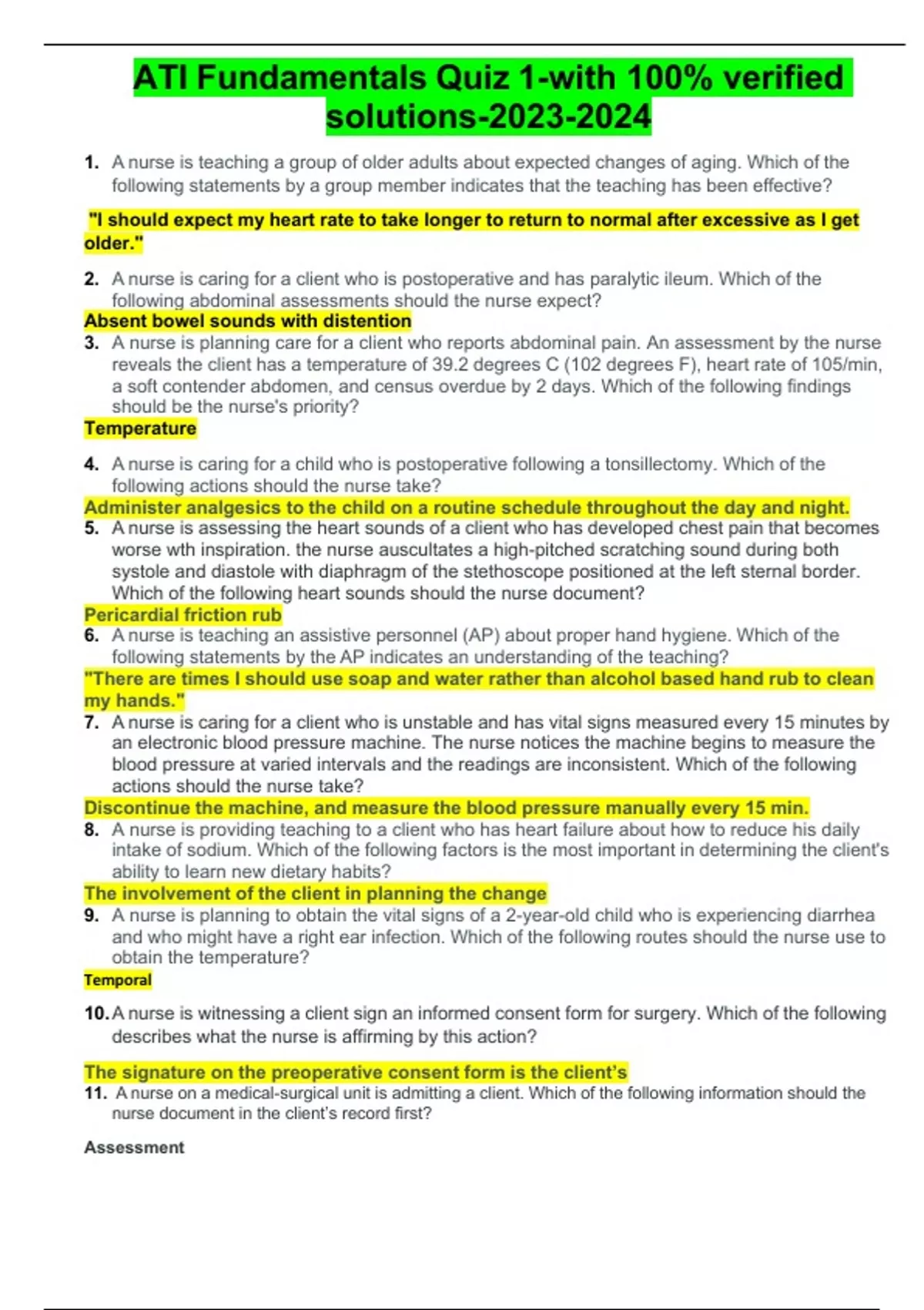 ATI Fundamentals Quiz 1-with 100% verified solutions-