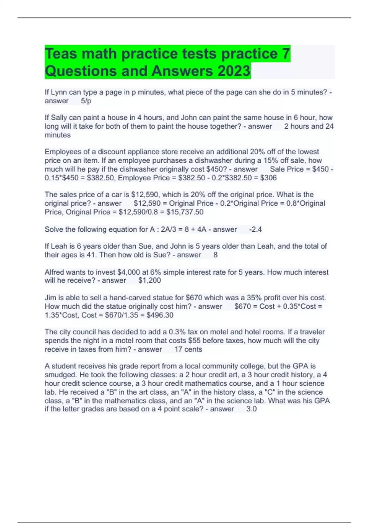Teas math practice tests practice 7 Questions and Answers 2023 If Lynn can type a page in p minutes, what piece of the page can she do in 5 minutes? 5/p If Sally can paint a house in 4 hours, and John can paint the same house in 6 hour, how long will it take for both of them to paint the house together? 2 hours and 24 minutes Employees of a discount appliance store receive an additional 20% off of the lowest price on an item. If an employee purchases a dishwasher during a 15% off sale, how much will he pay if the dishwasher originally cost $450? Sale Price = $450 - 0.15$450 = $382.50, Employee Price = $382.50 - 0.2$382.50 = $306 The sales price of a car is $12,590, which is 20% off the original price. What is the original price? $12,590 = Original Price - 0.2Original Price = 0.8Original Price, Original Price = $12,590/0.8 = $15,737.50 Solve the following equation for A : 2A/3 = 8 + 4A -2.4 If Leah is 6 years older than Sue, and John is 5 years older than Leah, and the total of their ages is 41. Then how old is Sue? 8 Alfred wants to invest $4,000 at 6% simple interest rate for 5 years. How much interest will he receive? $1,200 Jim is able to sell a hand-carved statue for $670 which was a 35% profit over his cost. How much did the statue originally cost him? $670 = Cost + 0.35Cost = 1.35Cost, Cost = $670/1.35 = $496.30 The city council has decided to add a 0.3% tax on motel and hotel rooms. If a traveler spends the night in a motel room that costs $55 before taxes, how much will the city receive in taxes from him? 17 cents A student receives his grade report from a local community college, but the GPA is smudged. He took the following classes: a 2 hour credit art, a 3 hour credit history, a 4 hour credit science course, a 3 hour credit mathematics course, and a 1 hour science lab. He received a "B" in the art class, an "A" in the history class, a "C" in the science class, a "B" in the mathematics class, and an "A" in the science lab. What was his GPA if the letter grades are based on a 4 point scale? 3.0 Simon arrived at work at 8:15 A.M. and left work at 10: 30 P.M. If Simon gets paid by the hour at a rate of $10 and time and ½ for any hours worked over 8 in a day. How much did Simon get paid? $173.75 Grace has 16 jellybeans in her pocket. She has 8 red ones, 4 green ones, and 4 blue ones. What is the minimum number of jellybeans she must take out of her pocket to ensure that she has one of each color? 13 If r = 5 z then 15 z = 3 y, then r = y If 300 jellybeans cost you x dollars. How many jellybeans can you purchase for 50 cents at the same rate? 150/x Lee worked 22 hours this week and made $132. If she works 15 hours next week at the same pay rate, how much will she make? $90 If 8x + 5x + 2x + 4x = 114, the 5x + 3 = 33 You need to purchase a textbook for nursing school. The book cost $80.00, and the sales tax where you are purchasing the book is 8.25%. You have $100. How much change will you receive back? $13.40 You purchase a car making a down payment of $3,000 and 6 monthly payments of $225. How much have you paid so far for the car? $4350 Your supervisor instructs you to purchase 240 pens and 6 staplers for the nurse's station. Pens are purchased in sets of 6 for $2.35 per pack. Staplers are sold in sets of 2 for 12.95. How much will purchasing these products cost? $132.85 If y = 3, then y3(y3-y)= 648 If the average of three numbers is V. If one of the numbers is Z and another is Y, what is the remaining number? 3V- Z - Y Two cyclists start biking from a trail's start 3 hours apart. The second cyclist travels at 10 miles per hour and starts 3 hours after the first cyclist who is traveling at 6 miles per hour. How much time will pass before the second cyclist catches up with the first from the time the second cyclist started biking? 4 ½ hours Jim can fill a pool carrying buckets of water in 30 minutes. Sue can do the same job in 45 minutes. Tony can do the same job in 1 ½ hours. How quickly can all three fill the pool together? 15 minutes Mary is reviewing her algebra quiz. She has determined that one of her solutions is incorrect. Which one is it? t - 2t - 3t = 32, t = 8 What simple interest rate will Susan need to secure to make $2,500 in interest on a $10,000 principal over 5 years? 5% A study reported that in a random sampling of 100 women over the age of 35 showed that 8 of the women were married 2 or more times. Based on the study results, how many women in a group of 5,000 women over the age of 35 would likely be married 2 or more times? 400 John is traveling to a meeting that is 28 miles away. He needs to be there in 30 minutes. How fast does he need to go to make it to the meeting on time? 56 mph If Steven can mix 20 drinks in 5 minutes, Sue can mix 20 drinks in 10 minutes, and Jack can mix 20 drinks in 15 minutes, how much time will it take all 3 of them working together to mix the 20 drinks? 2 minutes and 44 seconds If Sam can do a job in 4 days that Lisa can do in 6 days and Tom can do in 2 days, how long would the job take if Sam, Lisa, and Tom worked together to complete it? 1.09 days Jim has 5 pieces of string. He needs to choose the piece that will be able to go around his 36-inch waist. His belt broke, and his pants are falling down. The piece needs to be at least 4 inches longer than his waist so he can tie a knot in it, but it cannot be more that 6 inches longer so that the ends will not show from under his shirt. Which of the following pieces of string will work the best? 3 ½ feet The last week of a month a car dealership sold 12 cars. A new sales promotion came out the first week of the next month and the sold 19 cars that week. What was the percent increase in sales from the last week of the previous month compared to the first week of the next month? 58% If two planes leave the same airport at 1:00 PM, how many miles apart will they be at 3:00 PM if one travels directly north at 150 mph and the other travels directly west at 200 mph? 500 miles During a 5-da