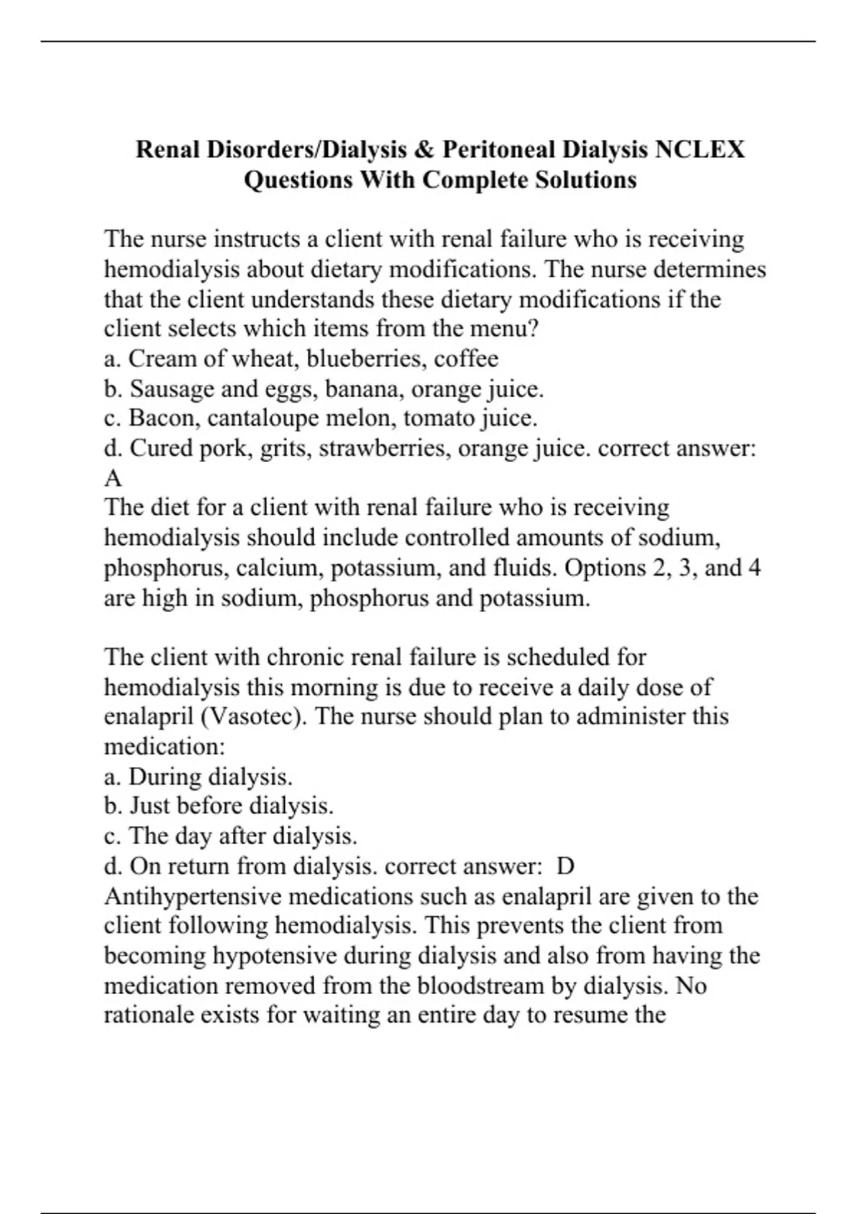 The nurse instructs a client with renal failure who is receiving hemodialysis about dietary modifications. The nurse determines that the client understands these dietary modifications if the client selects which items from the menu? a. Cream of wheat, blueberries, coffee b. Sausage and eggs, banana, orange juice. c. Bacon, cantaloupe melon, tomato juice. d. Cured pork, grits, strawberries, orange juice. correct answer: A The diet for a client with renal failure who is receiving hemodialysis should include controlled amounts of sodium, phosphorus, calcium, potassium, and fluids. Options 2, 3, and 4 are high in sodium, phosphorus and potassium. The client with chronic renal failure is scheduled for hemodialysis this morning is due to receive a daily dose of enalapril (Vasotec). The nurse should plan to administer this medication: a. During dialysis. b. Just before dialysis. c. The day after dialysis. d. On return from dialysis. correct answer: D Antihypertensive medications such as enalapril are given to the client following hemodialysis. This prevents the client from becoming hypotensive during dialysis and also from having the medication removed from the bloodstream by dialysis. No rationale exists for waiting an entire day to resume the medication. This would lead to ineffe