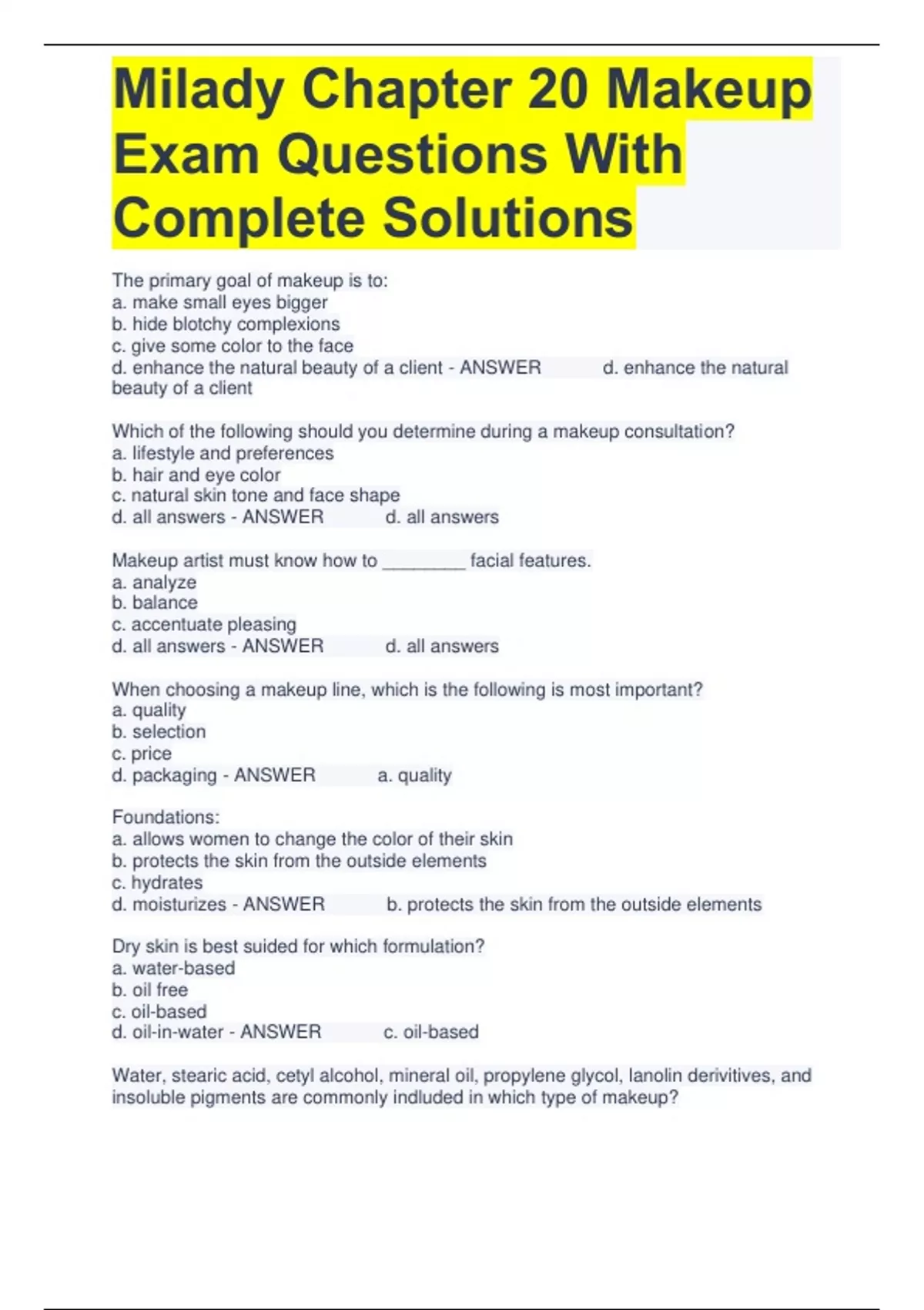 Milady Chapter 20 Makeup Exam Questions With Complete Solutions The primary goal of makeup is to: a. make small eyes bigger b. hide blotchy complexions c. give some color to the face d. enhance the natural beauty of a client - ANSWER d. enhance the natural beauty of a client Which of the following should you determine during a makeup consultation? a. lifestyle and preferences b. hair and eye color c. natural skin tone and face shape d. all answers - ANSWER d. all answers Makeup artist must know how to ________ facial features. a. analyze b. balance c. accentuate pleasing d. all answers - ANSWER d. all answers When choosing a makeup line, which is the following is most important? a. quality b. selection c. price d. packaging - ANSWER a. quality Foundations: a. allows women to change the color of their skin b. protects the skin from the outside elements c. hydrates d. moisturizes - ANSWER b. protects the skin from the outside elements Dry skin is best suided for which formulation? a. water-based b. oil free c. oil-based d. oil-in-water - ANSWER c. oil-based Water, stearic acid, cetyl alcohol, mineral oil, propylene glycol, lanolin derivitives, and insoluble pigments are commonly indluded in which type of makeup? a. mascara b. eye shadow c. foundation d. lip gloss - ANSWER c. foundation Thicker foundation that gives heavier coverage is a(n): a. oil and powder based foundation b. oil based foundation c. mineral foundation d. cream foundation - ANSWER d. cream foundation