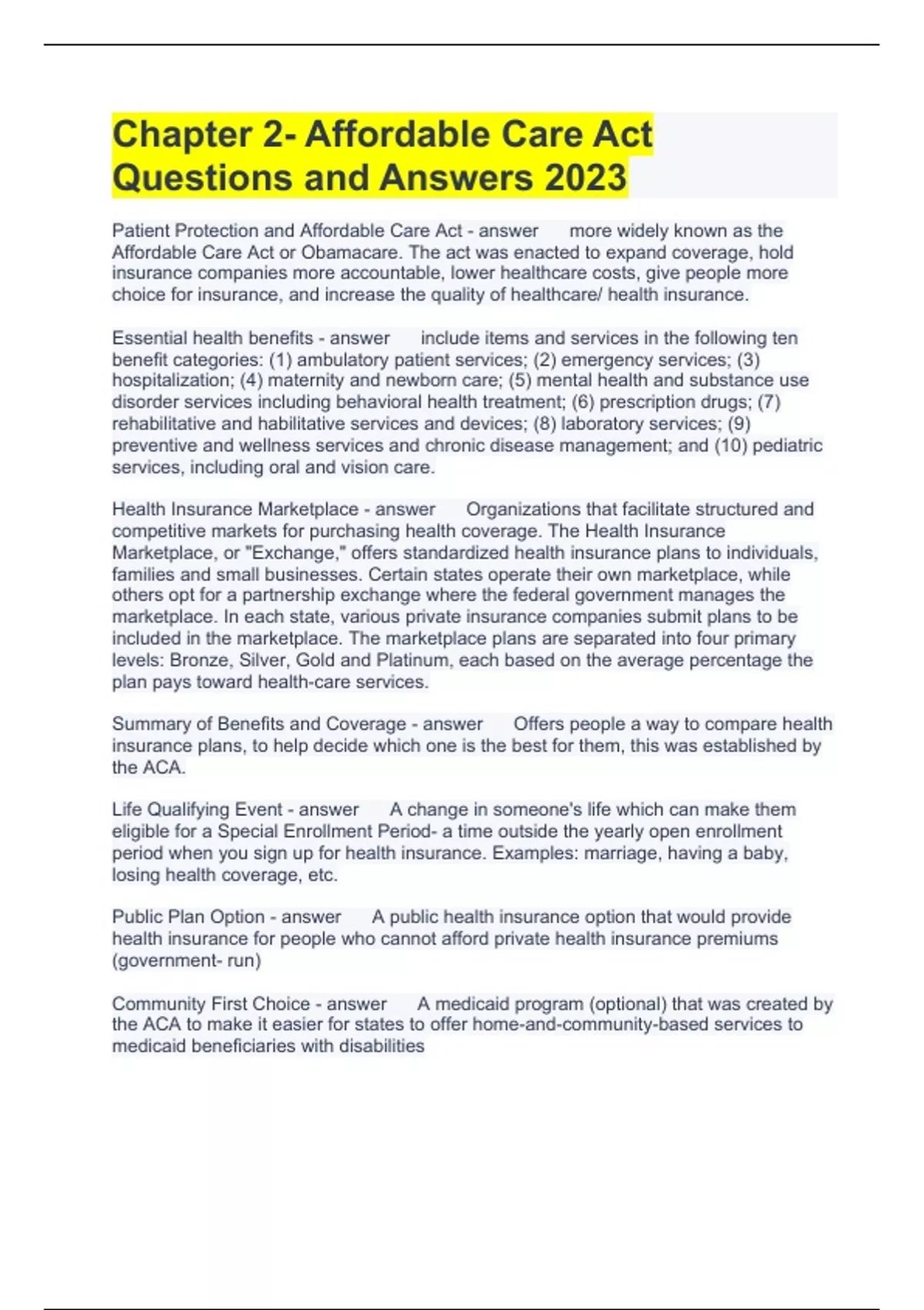 Chapter 2- Affordable Care Act Questions and Answers 2023