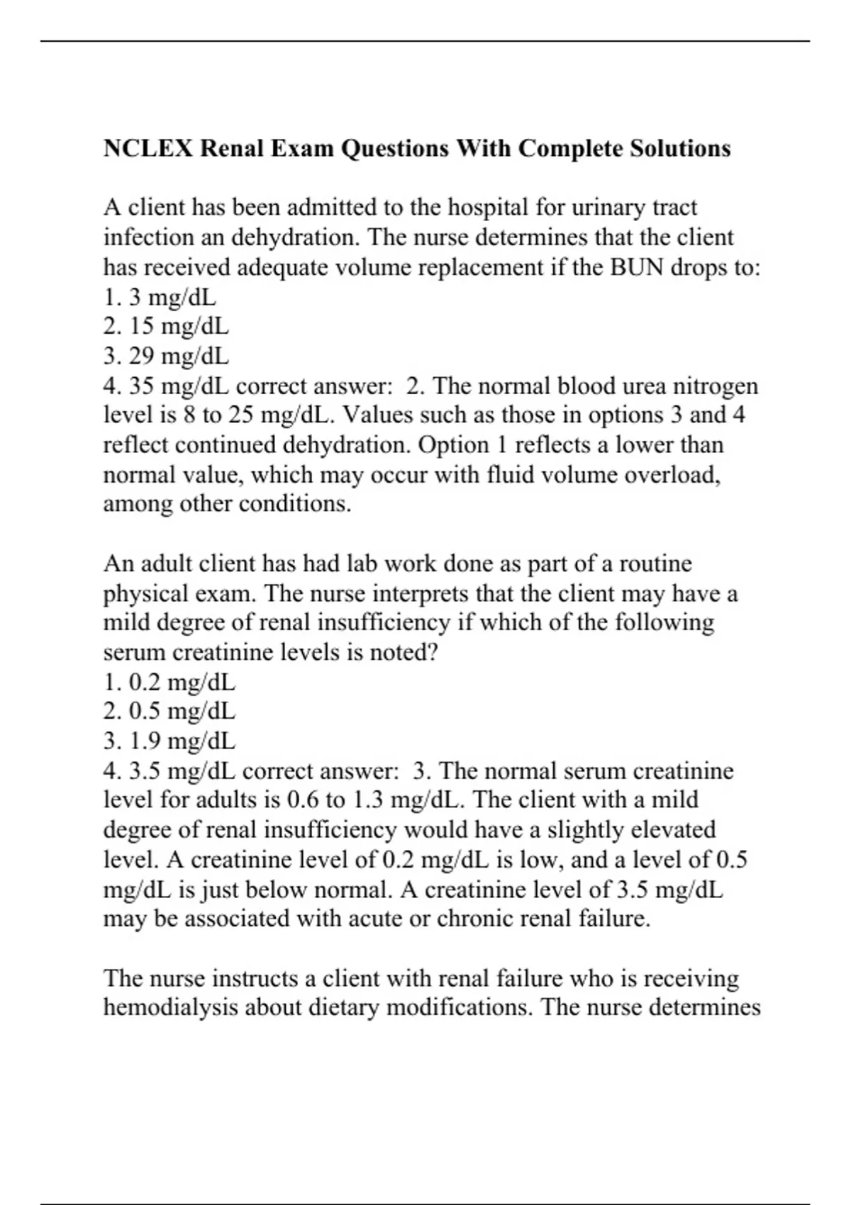 A client has been admitted to the hospital for urinary tract infection an dehydration. The nurse determines that the client has received adequate volume replacement if the BUN drops to: 1. 3 mg/dL 2. 15 mg/dL 3. 29 mg/dL 4. 35 mg/dL correct answer: 2. The normal blood urea nitrogen level is 8 to 25 mg/dL. Values such as those in options 3 and 4 reflect continued dehydration. Option 1 reflects a lower than normal value, which may occur with fluid volume overload, among other conditions. An adult client has had lab work done as part of a routine physical exam. The nurse interprets that the client may have a mild degree of renal insufficiency if which of the following serum creatinine levels is noted? 1. 0.2 mg/dL 2. 0.5 mg/dL 3. 1.9 mg/dL 4. 3.5 mg/dL correct answer: 3. The normal serum creatinine level for adults is 0.6 to 1.3 mg/dL. The client with a mild degree of renal insufficiency would have a slightly elevated level. A creatinine level of 0.2 mg/dL is low, and a level of 0.5 mg/dL is just below normal. A creatinine level of 3.5 mg/dL may be associated with acute or chronic renal failure. The nurse instructs a client with renal failure who is receiving hemodialysis about dietary modifications. The nurse determines that the client understands these dietary m