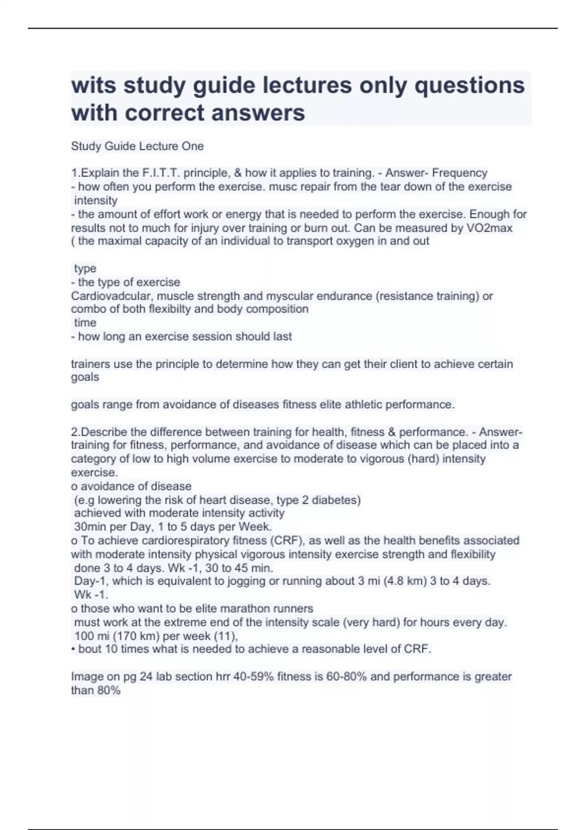 Study Guide Lecture One 1.Explain the F.I.T.T. principle, & how it applies to training. - Answer- Frequency - how often you perform the exercise. musc repair from the tear down of the exercise intensity - the amount of effort work or energy that is needed to perform the exercise. Enough for results not to much for injury over training or burn out. Can be measured by VO2max ( the maximal capacity of an individual to transport oxygen in and out type - the type of exercise Cardiovadcular, muscle strength and myscular endurance (resistance training) or combo of both flexibilty and body composition time - how long an exercise session should last trainers use the principle to determine how they can get their client to achieve certain goals goals range from avoidance of diseases fitness elite athletic performance. 2.Describe the difference between training for health, fitness & performance. - Answer- training for fitness, performance, and avoidance of disease which can be placed into a category of low to high volume exercise to moderate to vigorous (hard) intensity exercise. o avoidance of disease (e.g lowering the risk of heart disease, type 2 diabetes) achieved with moderate intensity activity 30min per Day, 1 to 5 days per Week. o To achieve cardiorespiratory fitness (CRF), as well as the health benefits associated with moderate intensity physical vigorous intensity exercise strength and flexibility done 3 to 4 days. Wk -1, 30 to 45 min. Day-1, which is equivalent to jogging or running about 3 mi (4.8 km) 3 to 4 days. Wk -1. o those who want to be elite marathon runners must work at the extreme end of the intensity scale (very hard) for hours every day. 100 mi (170 km) per week (11), • bout 10 times what is needed to achieve a reasonable level of CRF. Image on pg 24 lab section hrr 40-59% fitness is 60-80% and performance is greater than 80% 3.Define positive & negative health. - Answer- positive health is associated wit a capacity to enjoy life and withstand challenges. negative health is associated with morbidity (incidence of disease) and early mortality. the ultimate goal is ultimate quality of life with high level of physical functionality and emotional and psychological well being 4.What are the physical activity guidelines for health, weight maintenance & weight loss? - Answer- 30 minutes daily to avoid disease 60 minutes daily to prevent weight gain 60-90 minutes daily to sustain weight loss (very hard) 5.Distinguish between moderate & vigorous intensity in terms of CRF. - Answer- vigorous intensity exercise to produce better results for reducing risk factors in most individuals vigorous exercise reduces diastolic blood pressure increase glucose control and you have hired her respiratory fitness values then moderate exercise vigorous exercise is not safe or appropriate for all clients. more is better 6.List the ACSM guidelines for muscular fitness. - Answer- Perform 8-10 exercises for the major muscle groups including legs hips back chest shoulders and arms. Use resistance that produces muscular fatigue after 8 to 12 reps Complete one to three sets of each exercise. Participate in resistance training activities at least two non-consecutive days per week for recovery time 7.Distinguish between functional performance & sports performance. - Answer- Functional performance are exercises like cardiorespiratory Fitness muscular strength and endurance flexibility body leanness and task specific needs. Sport performance are exercises for agility balance coordination power speed and reaction time 8.List the alterable & inalterable (also called modifiable & non-modifiable) risk factors for CVD. - Answer- ...biological factors are inalterable environmental and lifestyle behaviors are alterable 9.What are the BMI ranges for underweight, normal, overweight & obese? - Answer- Below 18.5 18.5-24.9 25.0-29.9 Above 30 10.What are the healthy & clinical values for normal & high blood pressure? - Answer- Normal blood pressure 120/80 Hypertensive 140/90 11.Explain the purpose of physician's consent, waiver of liability, incident report, HSQ & PAR-Q. - Answer- When you have determined that the client is at high risk of cardiovascular disease from answering questions from the screening questionnaire After the consent from the doctor the final steps to client sign a consent waiver form to protect yourself and the gym incident reports in case anyone gets happened you can provide a file where you explain everything that happened for protection Health screening questionnaire identify risk factors lifestyle behaviors exercise history and red flags that may require program modification or Physicians consent Physical activity Readiness questionnaire Clyde the less detailed screening and self-administered type of screening to determine if the patient needs modifications or a physician's consent 12.What are the ranges for healthy & high blood glucose? - Answer- They vary throughout the day. For someone without diabetes, a fasting blood sugar on awakening should be under 100 mg/dl. Before-meal normal sugars are 70-99 mg/dl. "Postprandial" sugars taken two hours after meals should be less than 140 mg/dl. 13.What are the ranges & values for LDL & HDL cholesterol? - Answer- If you have a total cholesterol greater than 200 milligrams per deciliter or low density lipoprotein is greater than 130 milligrams per deciliter or high density lipoprotein is less than 40 milligrams per deciliter or risk factors for cardiovascular 14.Define characteristics of high-risk exercise participants. - Answer- Men and women with known cardiovascular metabolic or pulmonary disease men and women with major signs and symptoms of cardiovascular metabolic or pulmonary disease Moderate risk are asymptomatic men and women with greater than 2 risk factors Low risk are asymptomatic men and women with less than 1 or equal to 1 risk Factor 15.Explain the categories of pre-activity screening in terms of the acronym "MR. PLEASE". - Answer- Medical h