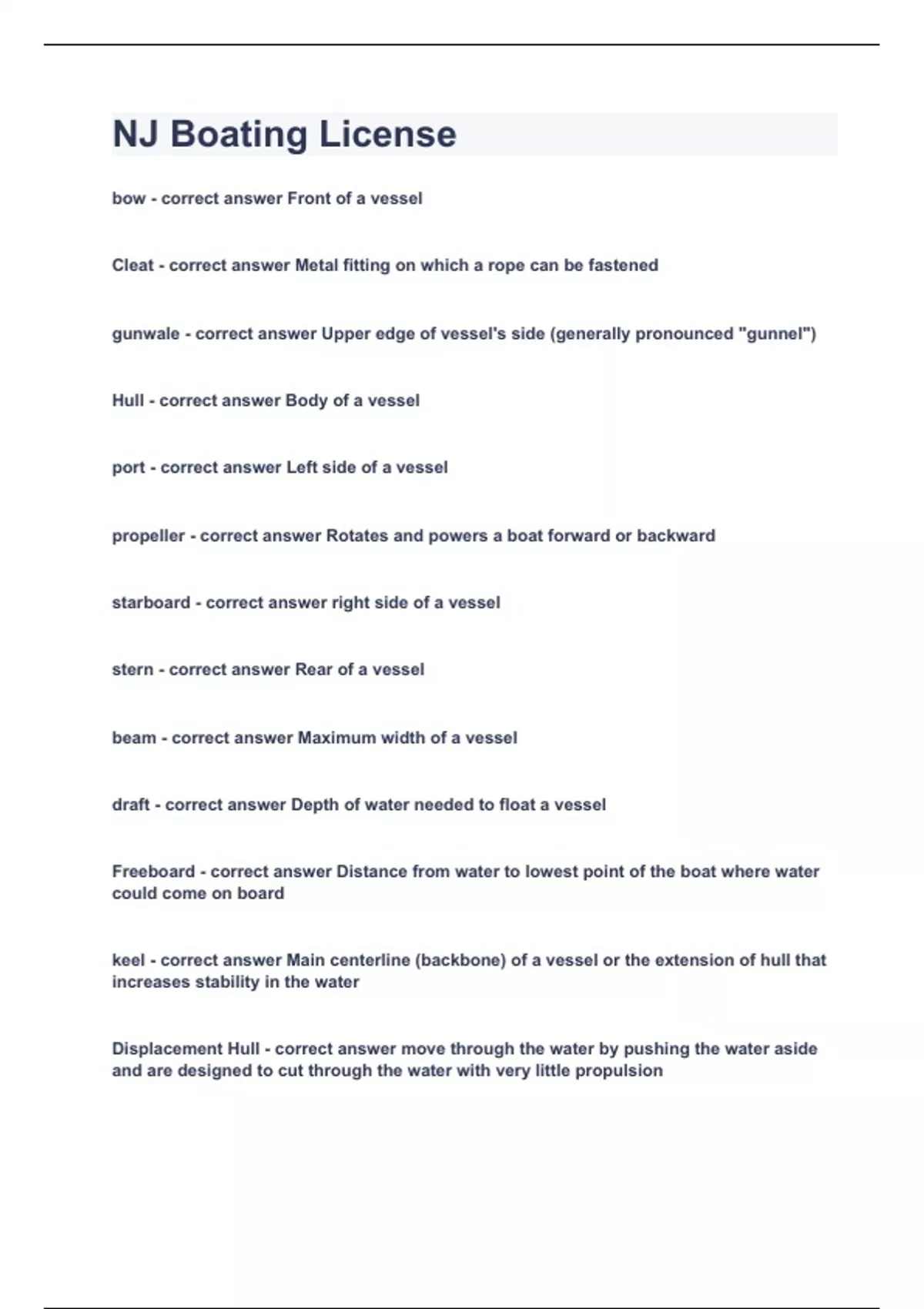 bow Front of a vessel Cleat Metal fitting on which a rope can be fastened gunwale Upper edge of vessel's side (generally pronounced "gunnel") Hull Body of a vessel port Left side of a vessel propeller Rotates and powers a boat forward or backward starboard right side of a vessel stern Rear of a vessel beam Maximum width of a vessel draft Depth of water needed to float a vessel Freeboard Distance from water to lowest point of the boat where water could come on board keel Main centerline (backbone) of a vessel or the extension of hull that increases stability in the water Displacement Hull move through the water by pushing the water aside and are designed to cut through the water with very little propulsion If you lower a boat into the water, some of the water moves out of the way to adjust for the boat. If you could weigh that displaced water, you would find it equals the weight of the boat. That weight is the boat's displacement. Boats with _________ hulls are limited to slower speeds. displacement A round-bottomed hull shape acts as a ___________________. Most large cruisers and most sailboats have ___________, allowing them to travel more smoothly through the water. displacement hulls Two types of Hulls displacement and planing personal watercraft A small vessel that uses an inboard jet drive as its primary source of propulsion, and is designed to be operated by a person or persons sitting, standing, or kneeling on the vessel rather than inside the vessel planing hulls are designed to rise up and glide on top of the water when enough power is supplied. These boats may operate like displacement hulls when at rest or at slow speeds but climb toward the surface of the water as they move faster. Boats with ______________can skim along at high speed, riding almost on top of the water rather than pushing it aside. planing hulls __________ and vee-bottomed hull shapes act as planing hulls. Flat-bottomed Most small power-driven vessels, including ___________ have planing hulls, allowing them to travel more rapidly across the water. personal watercraft (PWC), and some small sailboats Displacement Mode: A planing hull, when operated at very slow speeds, will cut through the water like a displacement hull. Plowing Mode: As speed increases, a planing hull will have a raised bow, reducing the operator's vision and throwing a very large wake. Avoid maintaining a speed that puts your boat in this mode Planing Mode: enough power is applied so that the hull glides on top of the water. Different boats reach planing mode at different speeds. flat bottomed hull Has a shallow draft, which is good for fishing in small lakes and rivers but Rides roughly in choppy waters. Deep-Vee Hull Gives a smoother ride than a flat-bottomed hull in rough water but Takes more power to move at the same speed as flat-bottomed hulls. May roll or bank in sharp turns. Round-Bottomed Hull Moves easily through the water even at slow speeds but has a tendency to roll unless it has a deep keel or stabilizers. Multi-Hull Has greater stability because of its wide beam but needs a large area when turning. Length overall is measured from the tip of the bow in a straight line to the stern of the vessel. ___________ are not included in the length measurement. Bowsprits; rudders; outboard motors and motor brackets; handles; and other fittings, attachments, and extensions length overall Length of the hull excluding any attachments