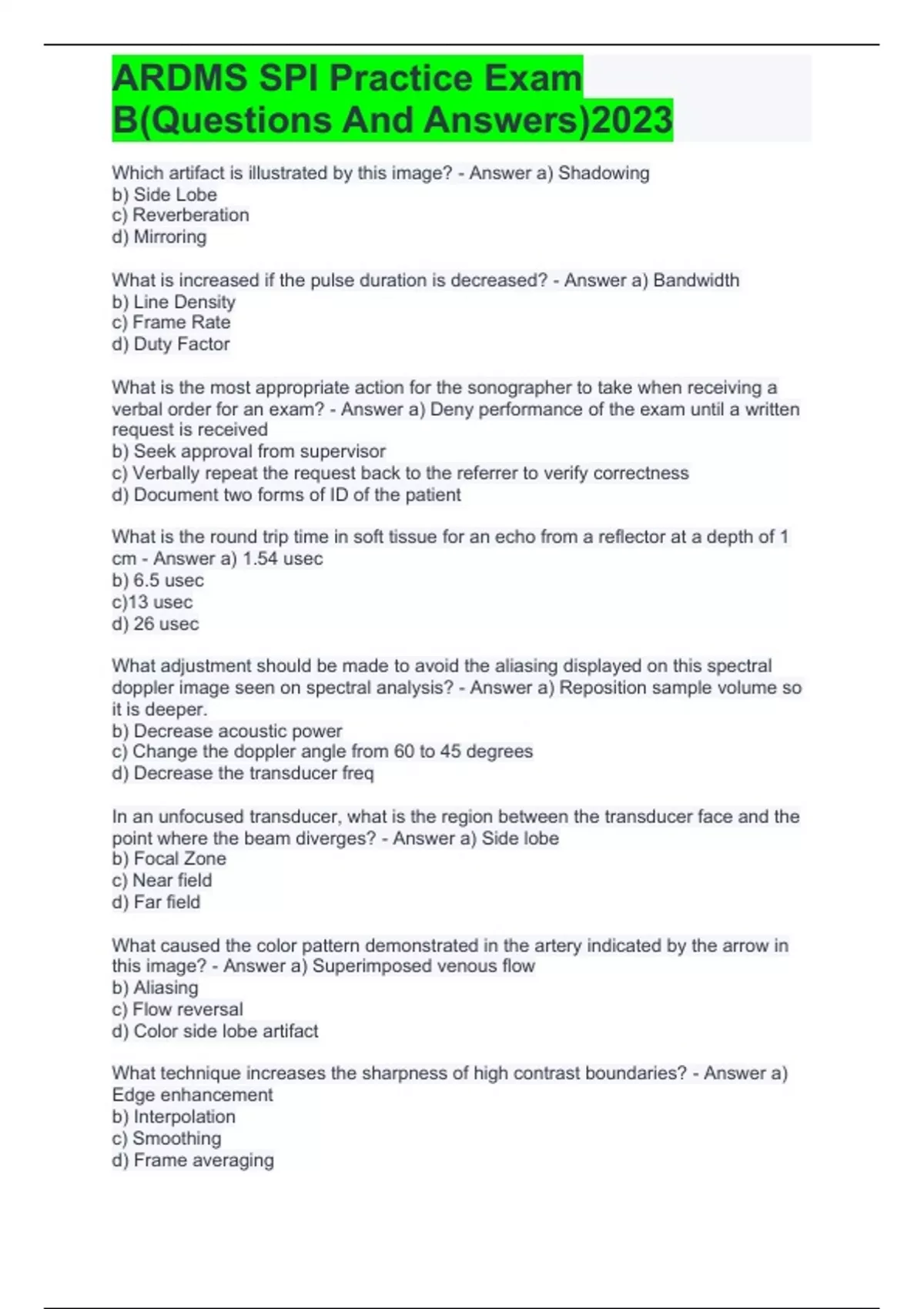 ardms spi practice exam b questions and answers
