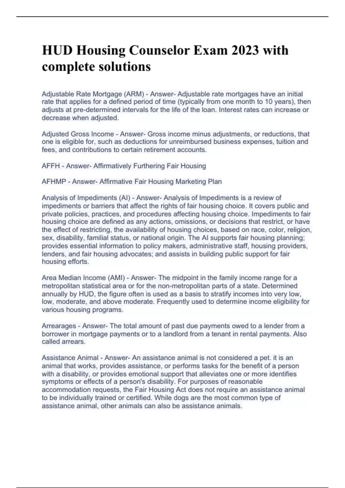 Adjustable Rate Mortgage (ARM) - Answer- Adjustable rate mortgages have an initial rate that applies for a defined period of time (typically from one month to 10 years), then adjusts at pre-determined intervals for the life of the loan. Interest rates can increase or decrease when adjusted. Adjusted Gross Income - Answer- Gross income minus adjustments, or reductions, that one is eligible for, such as deductions for unreimbursed business expenses, tuition and fees, and contributions to certain retirement accounts. AFFH - Answer- Affirmatively Furthering Fair Housing AFHMP - Answer- Affirmative Fair Housing Marketing Plan Analysis of Impediments (AI) - Answer- Analysis of Impediments is a review of impediments or barriers that affect the rights of fair housing choice. It covers public and private policies, practices, and procedures affecting housing choice. Impediments to fair housing choice are defined as any actions, omissions, or decisions that restrict, or have the effect of restricting, the availability of housing choices, based on race, color, religion, sex, disability, familial status, or national origin. The AI supports fair housing planning; provides essential information to policy makers, administrative staff, housing providers, lenders, and fair housing advocates; and assists in building public support for fair housing efforts. Area Median Income (AMI) - Answer- The midpoint in the family income range for a metropolitan statistical area or for the non-metropolitan parts of a state. Determined annually by HUD, the figure often is used as a basis to stratify incomes into very low, low, moderate, and above moderate. Frequently used to determine income eligibility for various housing programs. Arrearages - Answer- The total amount of past due payments owed to a lender from a borrower in mortgage payments or to a landlord from a tenant in rental payments. Also called arrears. Assistance Animal - Answer- An assistance animal is not considered a pet. it is an animal that works, provides assistance, or performs tasks for the benefit of a person with a disability, or provides emotional support that alleviates one or more identifies symptoms or effects of a person's disability. For purposes of reasonable accommodation requests, the Fair Housing Act does not require an assistance animal to be individually trained or certified. While dogs are the most common type of assistance animal, other animals can also be assistance animals. Association Dues - Answer- Charged by a community or Homeowners Association to pay for repairs, upkeep, landscaping, improvements, and property management. Back-End Ratio - Answer- A rate that calculates a borrower's total monthly debt, including housing and other debt obligations, as a percentage of gross monthly income. Frequently used by lenders to qualify borrowers for a mortgage. Also called a debt-to-income ratio. Balloon Payment - Answer- An oversize payment due at the end of a mortgage. Blockbusting - Answer- To convince, or attempt to convince, a person to sell or rent a dwelling because of the entry, or prospective entry, into the neighborhood of a person or persons of a particular race, color, religion, sex, familial status, national origin, or with a disability. Cash-for-keys - Answer- An alternative to a legal eviction following foreclosure. The occupant receives cash funds from the servicer in exchange for turning in the keys and vacating the property. Certain conditions apply, such as returning the property in broom-clean condition and with all appliances. CDBG - Answer- Community Development Block Grant CFPB - Answer- Consumer Financial Protection Bureau Closing Costs - Answer- Fees for final property transfer that are not included in the price of the property. Typical closing costs can include loan origination fees, discount points, appraisal fee, survey, title insurance, legal fees, real estate professional fees, prepayments of taxes and insurance, etc. While closing costs often range from 3% to 4% of the purchase price of the home, they can be lower or higher depending on the geographic region or loan type. Collection - Answer- An account in default with an original creditor and sold to a third-party debt collector that will continue attempts to collect past due payments. Community Development Block Grant Program - Answer- HUD program that provides grants to states and localities to provide decent housing and a suitable living environment and to expand economic opportunities, principally for low- and moderate-income persons. Complainant - Answer- A person, group, or company that files a complaint which claims that someone has violated a law. Conciliation - Answer- The attempted resolution of issues raised by a complaint, or by the investigation of such complaint, through informal negotiations involving the aggrieved person, the respondent, and the HUD Secretary. Conciliation Agreement - Answer- A written agreement setting terms for the resolution of the issues in conciliation. Consolidated Plan - Answer- A plan designed to help states and local jurisdictions to assess their affordable housing and community development needs and market conditions, and to make data-driven, location-based investment decisions. Conventional Loan - Answer- A mortgage loan backed by private lenders. Though not insured by any government program, such as FHA or VA, loans with a down payment less than 20% of the purchase price may require private mortgage insurance. Conventional Mortgage - Answer- A private sector loan typically issued to borrowers with high credit ratings. Excludes subprime loans or mortgages insured by the U.S. government. Credit Score - Answer- The numerical interpretation of a consumer's creditworthiness based on information in his or her credit report. Debt-to-Income Ratio - Answer- A rate that calculates a borrower's total monthly debt, including housing and other debt obligations, as a percentage of gross monthly income. Frequently used by lenders