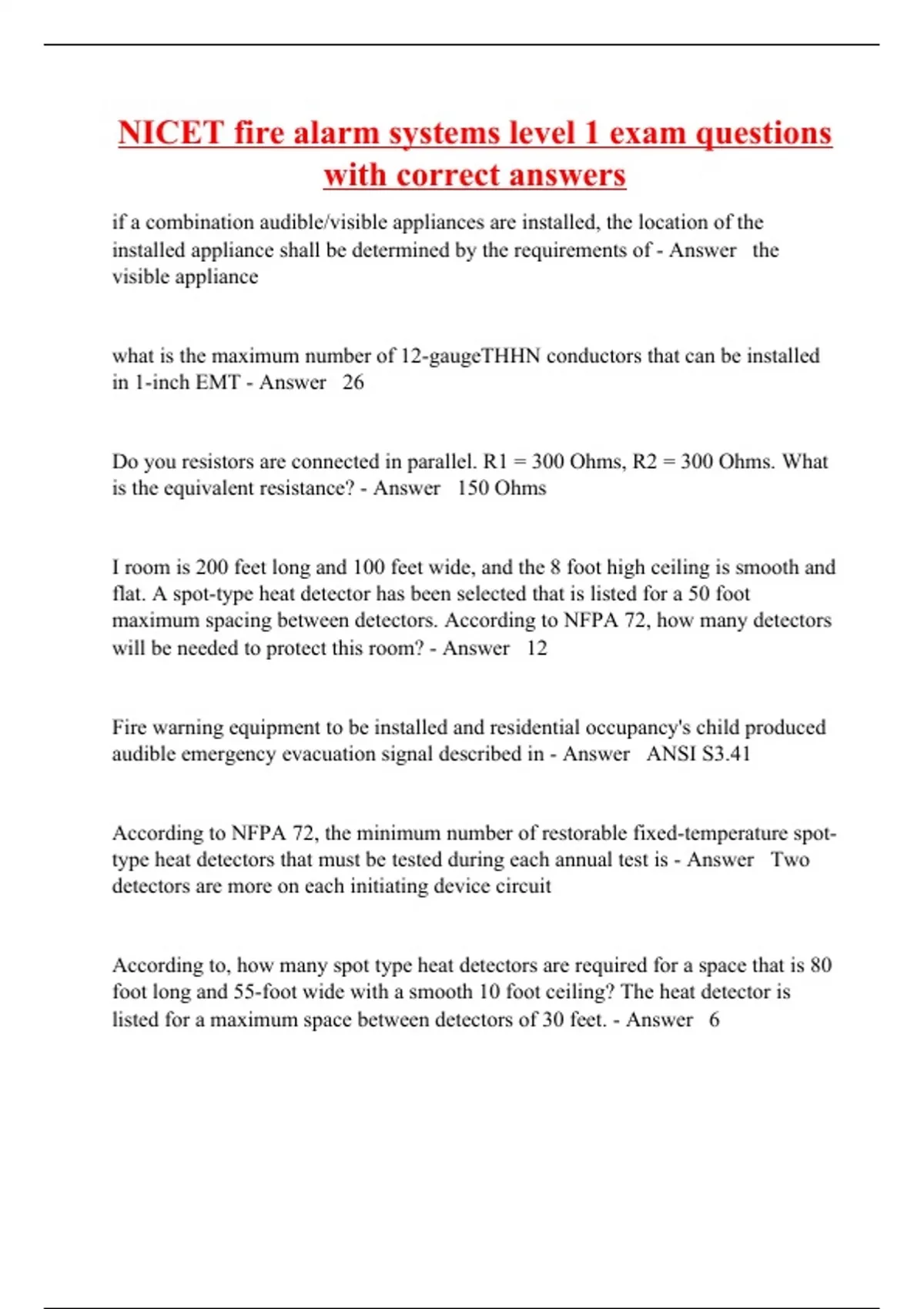 if a combination audible/visible appliances are installed, the location of the installed appliance shall be determined by the requirements of - Answer the visible appliance what is the maximum number of 12-gaugeTHHN conductors that can be installed in 1-inch EMT - Answer 26 Do you resistors are connected in parallel. R1 = 300 Ohms, R2 = 300 Ohms. What is the equivalent resistance? - Answer 150 Ohms