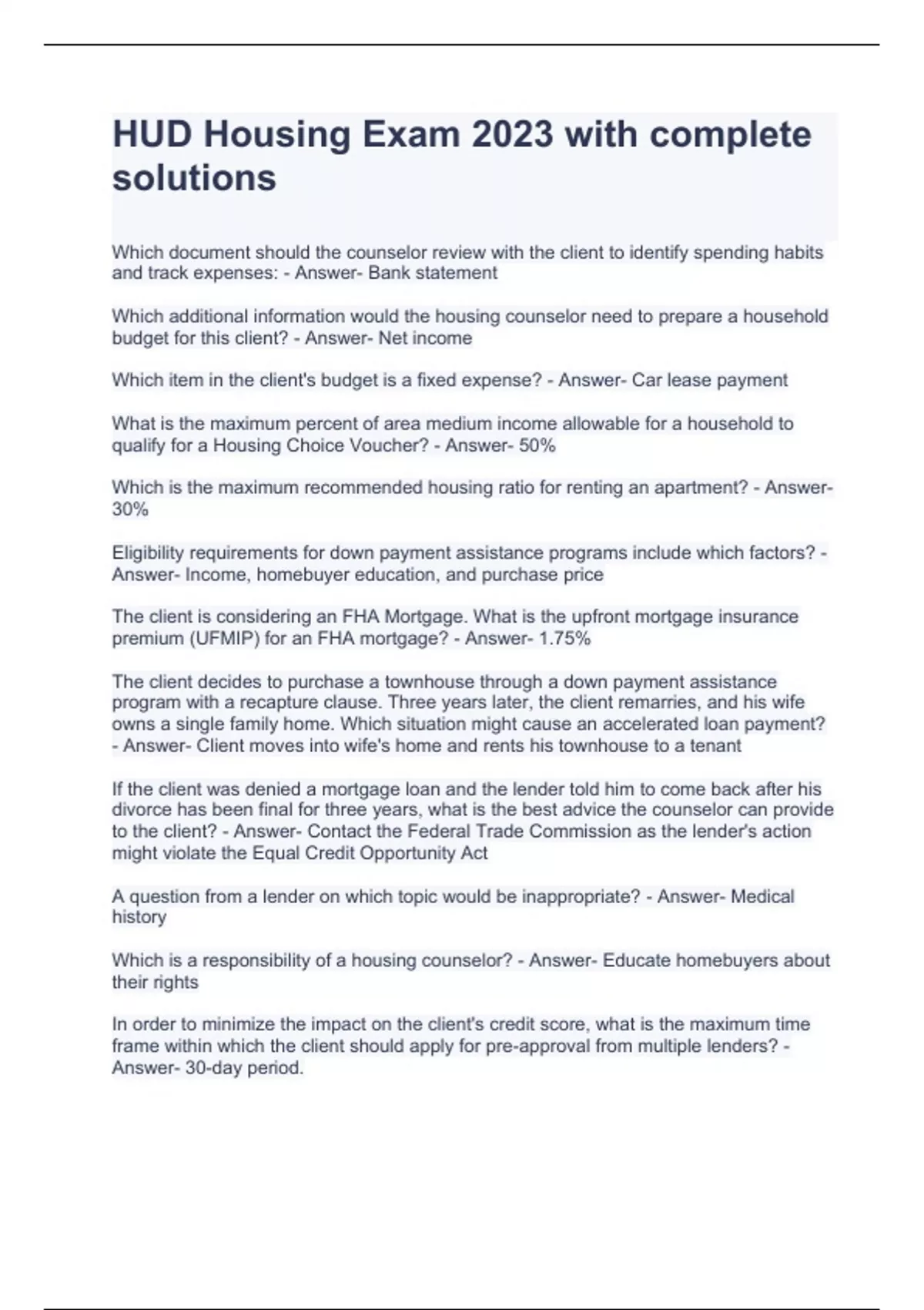 Which document should the counselor review with the client to identify spending habits and track expenses: - Answer- Bank statement Which additional information would the housing counselor need to prepare a household budget for this client? - Answer- Net income Which item in the client's budget is a fixed expense? - Answer- Car lease payment What is the maximum percent of area medium income allowable for a household to qualify for a Housing Choice Voucher? - Answer- 50% Which is the maximum recommended housing ratio for renting an apartment? - Answer- 30% Eligibility requirements for down payment assistance programs include which factors? - Answer- Income, homebuyer education, and purchase price The client is considering an FHA Mortgage. What is the upfront mortgage insurance premium (UFMIP) for an FHA mortgage? - Answer- 1.75% The client decides to purchase a townhouse through a down payment assistance program with a recapture clause. Three years later, the client remarries, and his wife owns a single family home. Which situation might cause an accelerated loan payment? - Answer- Client moves into wife's home and rents his townhouse to a tenant If the client was denied a mortgage loan and the lender told him to come back after his divorce has been final for three years, what is the best advice the counselor can provide to the client? - Answer- Contact the Federal Trade Commission as the lender's action might violate the Equal Credit Opportunity Act A question from a lender on which topic would be inappropriate? - Answer- Medical history Which is a responsibility of a housing counselor? - Answer- Educate homebuyers about their rights In order to minimize the impact on the client's credit score, what is the maximum time frame within which the client should apply for pre-approval from multiple lenders? - Answer- 30-day period. Which is a responsibility of a home inspector? - Answer- A) Evaluate condition of the home B) Examine medical systems C) identify items to be repaired or replaced Which is the best reason a counselor would suggest that client speak to three to five difference lenders before choosing one? - Answer- So the client can compre loan estimates Which is the best advice that a housing counselor can give to protect against identity theft? - Answer- Review credit report at least once a year The client tells the lender that he is expecting a raise soon. Which actions should the lender take? - Answer- Provide a loan estimate without factoring in the raise If the client obtains a mortgage of $100,000 typically how much should he expect to pay for closing costs? - Answer- $4k - 3-4% on average The client is considering renting an apartment with a different landlord. Which would be an upfront cost of living to the new apartment? - Answer- Application fee The client is second-guessing his decision to buy a home, so the counselor asks a series of questions. Which response would be best aligned with the homeownership option for this client? - Answer- Client wants to customize his home with do-it-yourself projects What is the maximum mortgage payment for which this client would qualify using a standard conventional loan? - Answer- $1,065 - 28% Which steps should the counselor take to assess the client's readiness to purchase a home? - Answer- A) Assess funda available for upfront costs B) Calculate debt-to-income ratio C) Determine máximum housing payment What is the maximum debt-to-income ratio for an FHA Loan? - Answer- 43% Debt-to-income ratio: - Answer- $435 debt payment plus mortgage payment $950 = $1,385 ($1,385/gross monthly income $4,166.67 = 33%) If the client seeks an FHA Energy Efficient Mortgage (EEM) what is the maximum housing payment for which he can qualify? - Answer- Use front-end ratio for EEM loan which is 31% $4,167 x 31% = $1,292.00 On which factor is a borrower's annual mortgage insurance premium (MIP) based? - Answer- Current principal balance Which is the upfront mortgage insurance premium if the client purchases a home with an FHA loan amount of $116,000? - Answer- $2,030 Multiple balance by 1.75% The client only tracks bill payments. Which should the housing counselor recommend to help the client begin planning for a home purchase? - Answer- Track all income and expenses How should client apply for the Housing Choice Voucher program? - Answer- Contact the local Public Housing Authority Which website provides information on programs to assist homebuyers with down payment assistance? - Answer- HUD.gov Based on the client's income, savings, and credit score of 700 which mortgage option is best? - Answer- Conventional loan This client is denied a loan to purchase a home because she has not lived in the country for a least ten years. Which advice should counselor provide? - Answer- Report the action to the Federal Trade Commission as it is a violation of the Equal Credit Opportunity Act If the client submits a loan application, which document should be received within 3 business was days? - Answer- Loan estimate Which best describes pre-approval from a lender? - Answer- The lender commits to a fixed amount based on a review of the client's application Does this client meet a lender's expectation for continued employment? - Answer- Yes, because the client has been at job over two years In reviewing a loan estimate, the counselor finds fees for services that seem unnecessary. What is most likely explanation for these fees? - Answer- Predatory lending practices The client thinks her cost of living is going to be the same because her mortgage payment and he rental payment are comparable. What are three recurring costs associated with homeownership that are not part of renting? - Answer- Homeowners insurance, property taxes, and home repairs Which additional information should the counselor request from the client to determine her readiness to purchase a home? - Answer- Expenses Which is the client's maximum mortgage payment if lender's housing ratio is 28% - Answer- $5