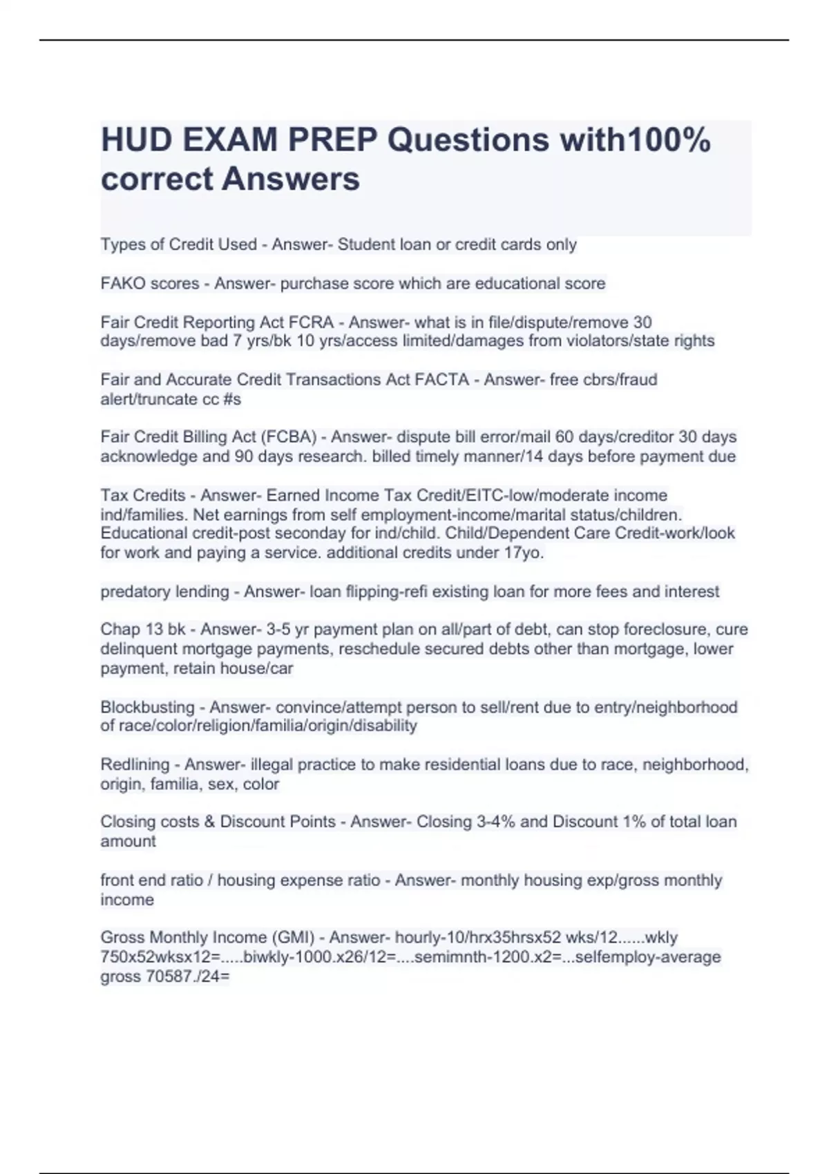 Types of Credit Used - Answer- Student loan or credit cards only FAKO scores - Answer- purchase score which are educational score Fair Credit Reporting Act FCRA - Answer- what is in file/dispute/remove 30 days/remove bad 7 yrs/bk 10 yrs/access limited/damages from violators/state rights Fair and Accurate Credit Transactions Act FACTA - Answer- free cbrs/fraud alert/truncate cc #s Fair Credit Billing Act (FCBA) - Answer- dispute bill error/mail 60 days/creditor 30 days acknowledge and 90 days research. billed timely manner/14 days before payment due Tax Credits - Answer- Earned Income Tax Credit/EITC-low/moderate income ind/families. Net earnings from self employment-income/marital status/children. Educational credit-post seconday for ind/child. Child/Dependent Care Credit-work/look for work and paying a service. additional credits under 17yo. predatory lending - Answer- loan flipping-refi existing loan for more fees and interest Chap 13 bk - Answer- 3-5 yr payment plan on all/part of debt, can stop foreclosure, cure delinquent mortgage payments, reschedule secured debts other than mortgage, lower payment, retain house/car Blockbusting - Answer- convince/attempt person to sell/rent due to entry/neighborhood of race/color/religion/familia/origin/disability Redlining - Answer- illegal practice to make residential loans due to race, neighborhood, origin, familia, sex, color Closing costs & Discount Points - Answer- Closing 3-4% and Discount 1% of total loan amount front end ratio / housing expense ratio - Answer- monthly housing exp/gross monthly income Gross Monthly Income (GMI) - Answer- hourly-10/hrx35hrsx52 wks/12......wkly 750x52wksx12=.....biwkly-1000.x26/12=....semimnth-1200.x2=...selfemploy-average gross 70587./24= back-end ratio - Answer- debt exp/gross debt to income ratio Affordability - Answer- FE/Conv 28, FHA 31, FHAEE 33, Rent 30....BE/Conv 36(45-50), FHA 43, FHAEE 45, Rent 36 Max Mnthly House Pymt - Answer- FERxgmi BERxgmi-debts 2nd mort/piggy back loan - Answer- lower 1st mort, avoid private morg ins, repairs, education mortg terms - Answer- interest only-pay only interest for a fixed term after borrower pays principal/interest, fixed rate-interest fixed 30 yrs or 10-15, Adjustable-interest adjust and has cap Loan-to-Value Ratio - Answer- LTV%=loan bal/sales price/appraised x 100 down payment - Answer- conv-varies, FHA-580+96.5%LTV or 3.5% down, LTV or 10 down, VA/USDA-none Mort Ins - Answer- Private Morg Ins-priv loans conv/subprime, Up Front-FHA, VA, USDA, Mort Ins Premium-FHA, VA, USDA Civil Rights Act of 1866 - Answer- all natural citizens except american indians 1896 Plessy v. Ferguson - Answer- ruled that segregation was allowed, as long as the facilities were "separate but equal" 1933 Home Owners Loan Corporation (HOLC) - Answer- Conress to avoid foreclosures during great depression/refinance mort in default 1948 Shelly v Kraemer - Answer- deed restrictions deemed illegal 1954 Brown v. Board of Education - Answer- This famous Supreme Court case over turned Plessy v. Ferguson. The Brown decision stated that separated but equalities were inherently unequal. 1962 Executive Order 11063 - Answer- JFK prohibit discrimination in sale/lease/rent backed by federal funds 1964 Civil Rights Act - Answer- This act prohibited Discrimination because of race, color, sex, religion, or national origin by employers or labor unions 1968 Civil Rights Act - Answer- This was passed in response to MLK Jr's assassination. Called the Fair Housing Act. Prohibits discrimination in housing sales, rentals, advertising, and financing based on race, color, national origin, and religion. It also obligated federal agencies to affirmatively further fair housing. 1968 HUD - Answer- Established Ginnie Mae, to expand the availability of government-secured home loans to moderate-income families 1974 & 1988 - Answer- 1974/sex & 1988/disability & familia 2010 LGBT - Answer- HUD issued a new policy that provides lesbian, gay, bisexual, and transgender individuals and families with further assistance when facing housing discrimination. The new guidance treats "gender identity discrimination" as gender discrimination. Extra protection for disabled - Answer- Covered multifamily dwellings available for occupancy after March 13, 1991, must be usable and accessible for persons with disabilities including design of: doors, accessible routes, environmental controls, grab bars, and usable kitchens. Section 504 of the Rehabilitation Act of 1973 - Answer- Requires that housing providers that receive federal financial assistance make and pay for structural changes to facilities, if needed as a reasonable accommodation unless doing so poses an undue financial and administrative burden. Assistant Animal - Answer- An assistance animal is not a pet. An assistance animal works, provides assistance, or performs tasks for the person or provides emotional support that alleviates one or more identified symptoms or effects of a person's disability. Assistance animals do not have to be trained or certified, and are not limited to dogs. Exemptions to the Fair Housing Act - Answer- Single Family-1. Owns, sells, or rents the house 2. Owns 3 or fewer single family homes 3. Does not use a real-estate broker. Mrs Murphy-The house or living quarter is occupied by or intended to be occupied by no more than four independent families and the owner 2. The owner has three or fewer rental units. Religious-Housing is not operated commercially 2. Housing is made available to persons of the same religion. Private Club-The housing is not open to the public 2. The housing is incidental to the primary purpose The hosing is not operated commercially. Elderly-1. Housing is designed for the elderly 2. 100% of the community is 62 or older; or 80% of the households have one resident who is 55+ Real Estate Related Transaction - Answer- According to the Fair Housing Act, a real estate related transaction means any of the following: • the making or purchasi