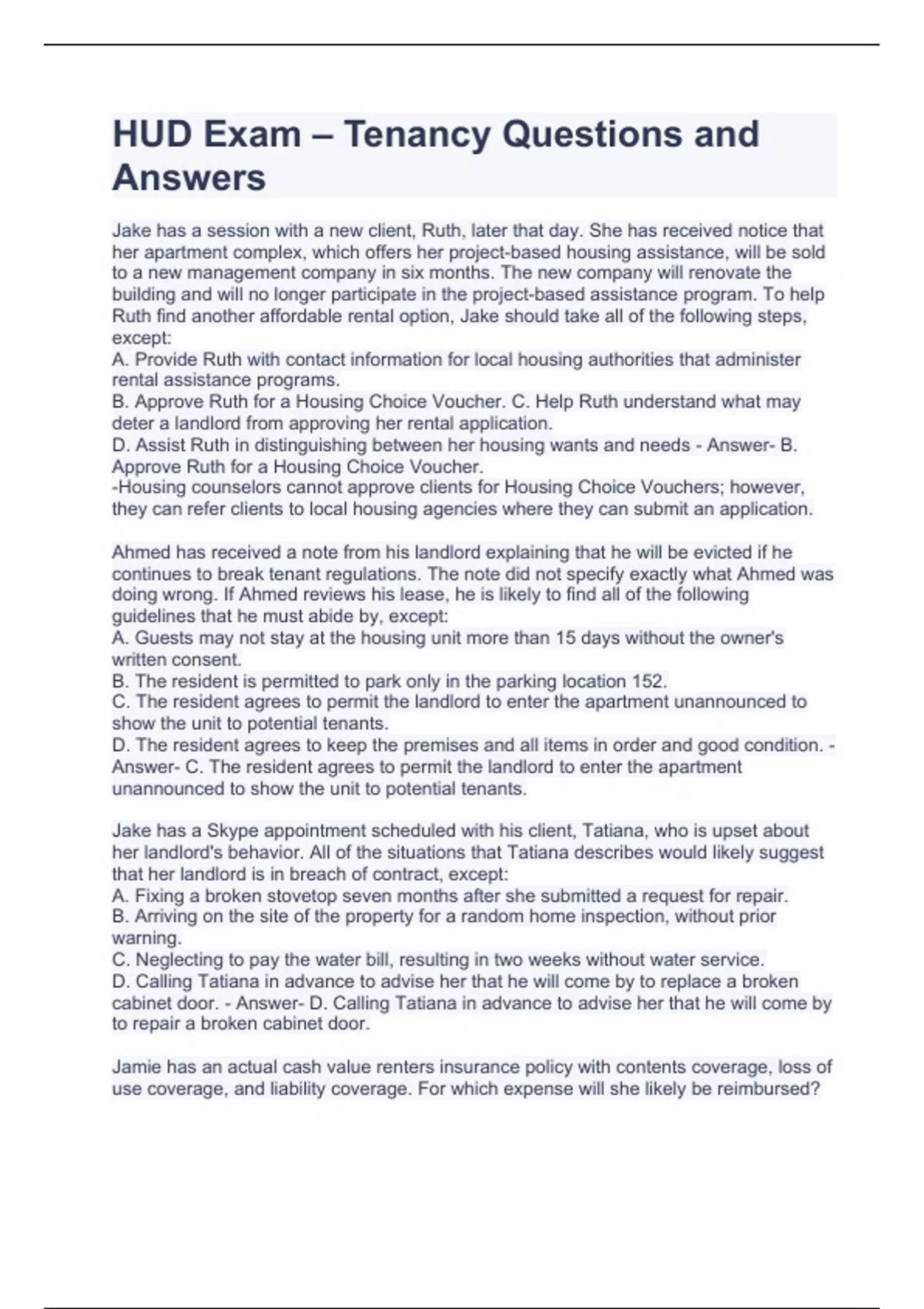 Jake has a session with a new client, Ruth, later that day. She has received notice that her apartment complex, which offers her project-based housing assistance, will be sold to a new management company in six months. The new company will renovate the building and will no longer participate in the project-based assistance program. To help Ruth find another affordable rental option, Jake should take all of the following steps, except: A. Provide Ruth with contact information for local housing authorities that administer rental assistance programs. B. Approve Ruth for a Housing Choice Voucher. C. Help Ruth understand what may deter a landlord from approving her rental application. D. Assist Ruth in distinguishing between her housing wants and needs - Answer- B. Approve Ruth for a Housing Choice Voucher. -Housing counselors cannot approve clients for Housing Choice Vouchers; however, they can refer clients to local housing agencies where they can submit an application. Ahmed has received a note from his landlord explaining that he will be evicted if he continues to break tenant regulations. The note did not specify exactly what Ahmed was doing wrong. If Ahmed reviews his lease, he is likely to find all of the following guidelines that he must abide by, except: A. Guests may not stay at the housing unit more than 15 days without the owner's written consent. B. The resident is permitted to park only in the parking location 152. C. The resident agrees to permit the landlord to enter the apartment unannounced to show the unit to potential tenants. D. The resident agrees to keep the premises and all items in order and good condition. - Answer- C. The resident agrees to permit the landlord to enter the apartment unannounced to show the unit to potential tenants. Jake has a Skype appointment scheduled with his client, Tatiana, who is upset about her landlord's behavior. All of the situations that Tatiana describes would likely suggest that her landlord is in breach of contract, except: A. Fixing a broken stovetop seven months after she submitted a request for repair. B. Arriving on the site of the property for a random home inspection, without prior warning. C. Neglecting to pay the water bill, resulting in two weeks without water service. D. Calling Tatiana in advance to advise her that he will come by to replace a broken cabinet door. - Answer- D. Calling Tatiana in advance to advise her that he will come by to repair a broken cabinet door. Jamie has an actual cash value renters insurance policy with contents coverage, loss of use coverage, and liability coverage. For which expense will she likely be reimbursed? A. The cost of rebuilding the living room, which was destroyed by fire. B. The entire cost of purchasing a brand new bedroom set damaged by a pipe burst and subsequent water damage. C. Expenses associated with purchasing replacement materials for the artwork she sells through an online vendor. D. Expenses for legal fees when Jamie is sued by her daughter's classmate who injured himself when he tripped over clutter at Jamie's apartment. - Answer- D. Expenses for legal fees when Jamie is sued by her daughter's classmate who injured himself when he tripped over clutter at Jamie's apartment. Jake has clients in all of the following situations. Which client would Jake likely recommend contact an emergency rent assistance program? A. The client wants to quit working to return to college and will need help paying for rent while in school. B. The client cannot afford a rental in the area and needs a housing subsidy to obtain a rental. C. The client has been living with a roommate who suddenly moves and does not leave his portion of the month's rent. D. The client has been notified that her rent will increase by $200 per month if she decides to remain in her apartment after her lease comes up for renewal in four months. She cannot afford to pay an additional $200 a month. - Answer- C. The client has been living with a roommate who suddenly moves and does not leave his portion of the month's rent. -If the roommate did not leave his portion of the rent, the client may not have enough money to pay the full amount of rent. If he does not pay in full, he may be threatened by eviction. Emergency rent assistance programs are likely to assist in this situation. A client with two cats received a cure or quit notice. Which following action would a housing counselor likely recommend to someone in this situation? A. Send an "answer" to the court explaining that the animal is not considered a pet. B. Find another home for the animal within the time frame outlined in the notice. C. Consult with a housing counselor to find housing in preparation for the eviction. D. Hide the cat at a friend's house for a few days or until things cool off with the landlord. - Answer- B. Find another home for the animal within the time frame outlined in the notice. All of the following clients are facing challenges with rental housing. Which client would Jake likely refer to an emergency shelter? A. The client had an unexpected medical expense and knows she will not be able to afford utilities for several months. B. The client cannot afford rental in the new area where he plans to move. C. The client has received a pay rent or quit notice. D. The client did not pay rent within five days of the final judgment and will be evicted in hours. - Answer- D. The client did not pay rent within five days of the final judgment and will be evicted in 24 hours. One of Jake's clients, Anna, has been informed by the City Marshal that she has 72 hours to move out of her rental home. Jake recommends that she temporarily live in an emergency shelter. All of the following are typical characteristics of homeless shelters, except: A. Homeless shelters do not allow individuals to stay longer than 90 days. B. Homeless shelters provide training, counseling, and/or case management. C. Homeless shelters may require residents to pay a small fee for admitt