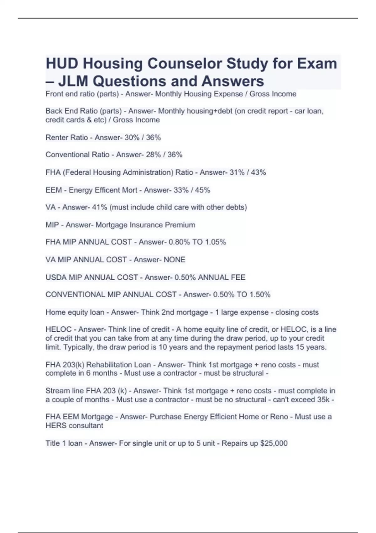 HUD Housing Counselor Study for Exam – JLM Questions and Answers