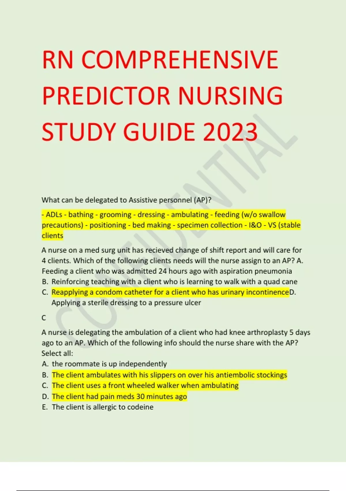ATI RN COMPREHENSIVE PREDICTOR NURSING STUDY GUIDE 2023 What can be delegated to Assistive personnel (AP)? - ADLs - bathing - grooming - dressing - ambulating - feeding (w/o swallow precautions) - positioning - bed making - specimen collection - I&O - VS (stable clients A nurse on a med surg unit has recieved change of shift report and will care for 4 clients. Which of the following clients needs will the nurse assign to an AP? A. Feeding a client who was admitted 24 hours ago with aspiration pneumonia B. Reinforcing teaching with a client who is learning to walk with a quad cane C. Reapplying a condom catheter for a client who has urinary incontinenceD. Applying a sterile dressing to a pressure ulcer C A nurse is delegating the ambulation of a client who had knee arthroplasty 5 days ago to an AP. Which of the following info should the nurse share with the AP? Select all: A. the roommate is up independently B. The client ambulates with his slippers on over his antiembolic stockings C. The client uses a front wheeled walker when ambulating D. The client had pain meds 30 minutes ago E. The client is allergic to codeine