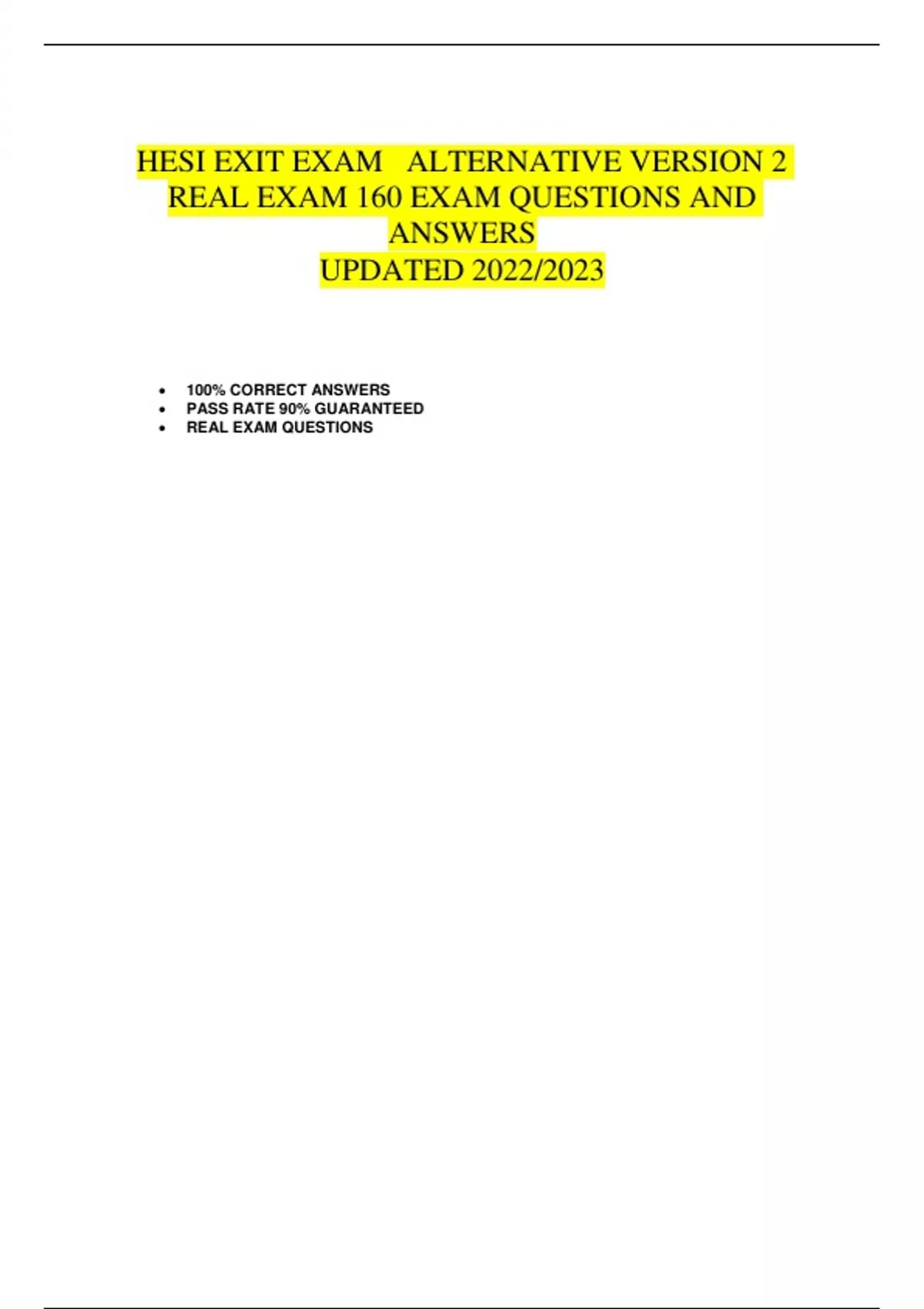 HESI EXIT EXAM ALTERNATIVE VERSION 2 REAL EXAM 160 EXAM QUESTIONS AND ANSWERS UPDATED 2022/2023