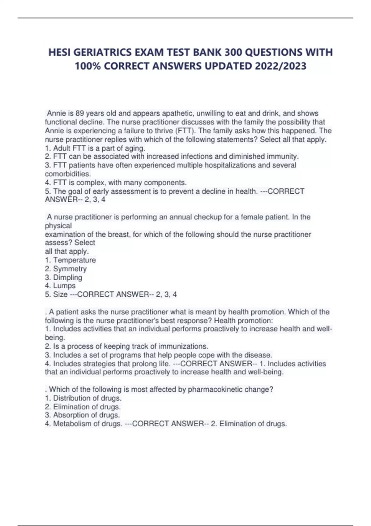 HESI GERIATRICS EXAM TEST BANK 300 QUESTIONS WITH 100% CORRECT ANSWERS UPDATED 2022/2023