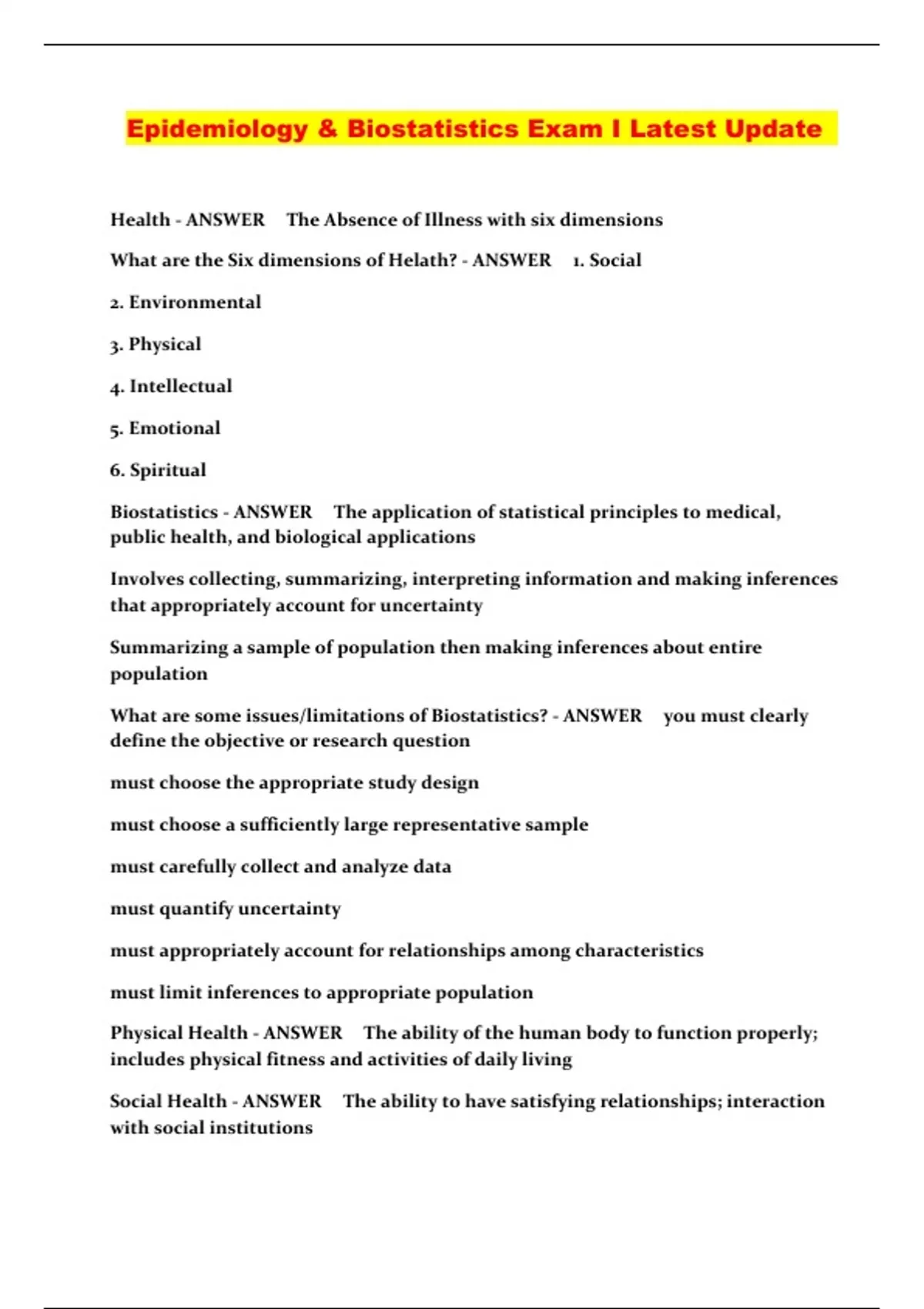 Epidemiology & Biostatistics Exam I Latest Update