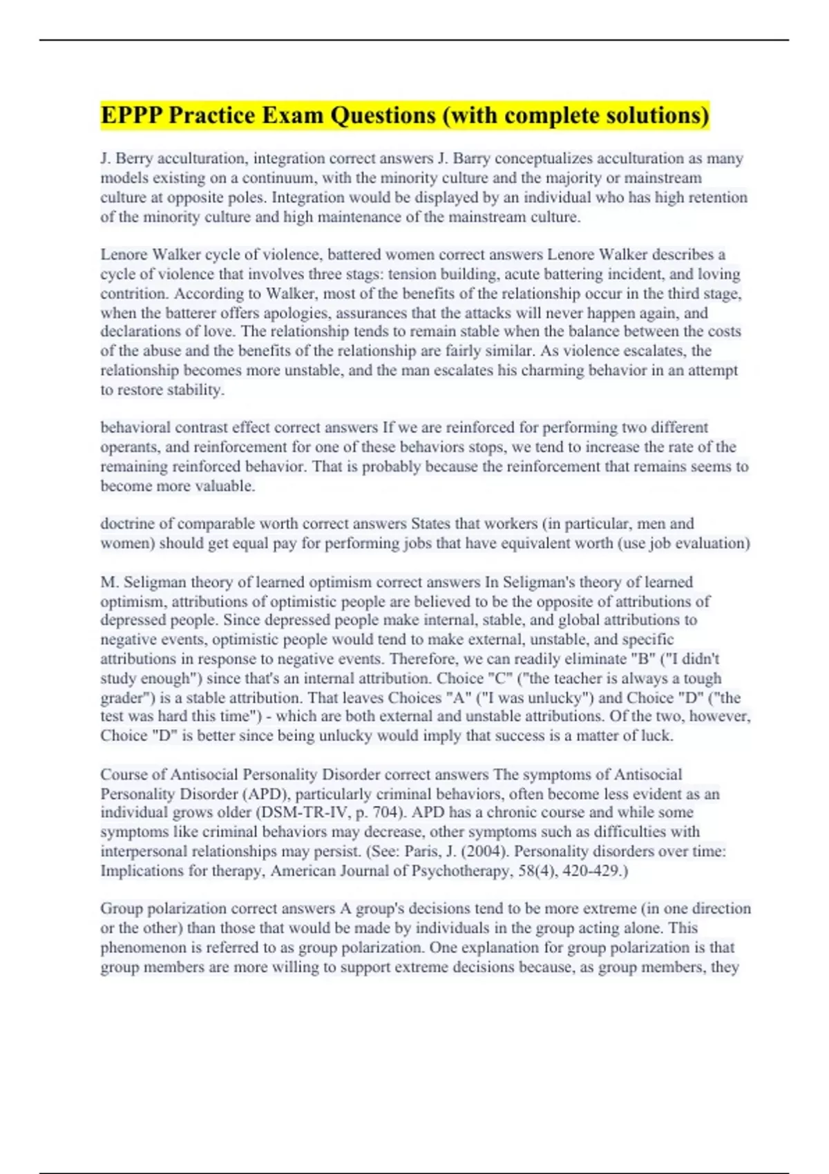 J. Berry acculturation, integration correct answers J. Barry conceptualizes acculturation as many models existing on a continuum, with the minority culture and the majority or mainstream culture at opposite poles. Integration would be displayed by an individual who has high retention of the minority culture and high maintenance of the mainstream culture. Lenore Walker cycle of violence, battered women correct answers Lenore Walker describes a cycle of violence that involves three stags: tension building, acute battering incident, and loving contrition. According to Walker, most of the benefits of the relationship occur in the third stage, when the batterer offers apologies, assurances that the attacks will never happen again, and declarations of love. The relationship tends to remain stable when the balance between the costs of the abuse and the benefits of the relationship are fairly similar. As violence escalates, the relationship becomes more unstable, and the man escalates his charming behavior in an attempt to restore stability. behavioral contrast effect correct answers If we are reinforced for performing two different operants, and reinforcement for one of these behaviors stops, we tend to increase the rate of the remaining reinforced behavior. That is probably because the reinforcement that remains seems to become more valuable. doctrine of comparable worth correct answers States that workers (in particular, men and women) should get equal pay for performing jobs that have equivalent worth (use job evaluation) M. Seligman theory of learned optimism correct answers In Seligman's theory of learned optimism, attributions of optimistic people are believed to be the opposite of attributions of depressed people. Since depressed people make internal, stable, and global attributions to negative events, optimistic people would tend to make external, unstable, and specific attributions in response to negative events. Therefore, we can readily eliminate "B" ("I didn't study enough") since that's an internal attribution. Choice "C" ("the teacher is always a tough grader") is a stable attribution. That leaves Choices "A" ("I was unlucky") and Choice "D" ("the test was hard this time") - which are both external and unstable attributions. Of the two, however, Choice "D" is better since being unlucky would imply that success is a matter of luck. Course of Antisocial Personality Disorder correct answers The symptoms of Antisocial Personality Disorder (APD), particularly criminal behaviors, often become less evident as an individual grows older (DSM-TR-IV, p. 704). APD has a chronic course and while some symptoms like criminal behaviors may decrease, other symptoms such as difficulties with interpersonal relationships may persist. (See: Paris, J. (2004). Personality disorders over time: Implications for therapy, American Journal of Psychotherapy, 58(4), 420-429.) Group polarization correct answers A group's decisions tend to be more extreme (in one direction or the other) than those that would be made by individuals in the group acting alone. This phenomenon is referred to as group polarization. One explanation for group polarization is that group members are more willing to support extreme decisions because, as group