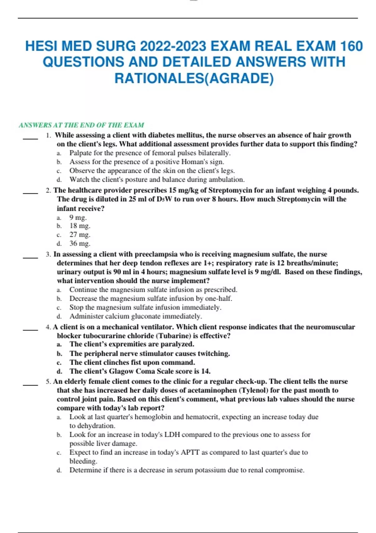 HESI MED SURG EXAM REAL EXAM 160 QUESTIONS AND DETAILED ANSWERS WITH RATIONALES(AGRADE)