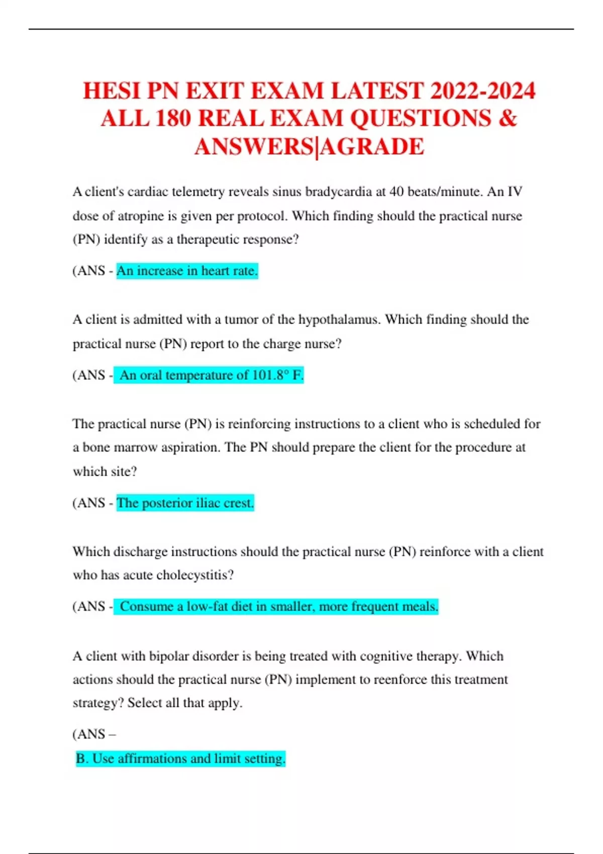 HESI PN EXIT EXAM LATEST ALL 180 REAL EXAM QUESTIONS & ANSWERS|AGRADE