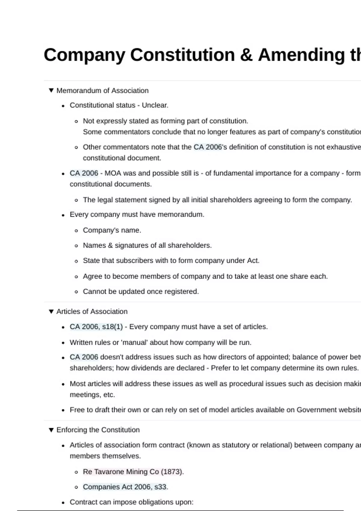 Summary Company Constitution & Amending the Articles