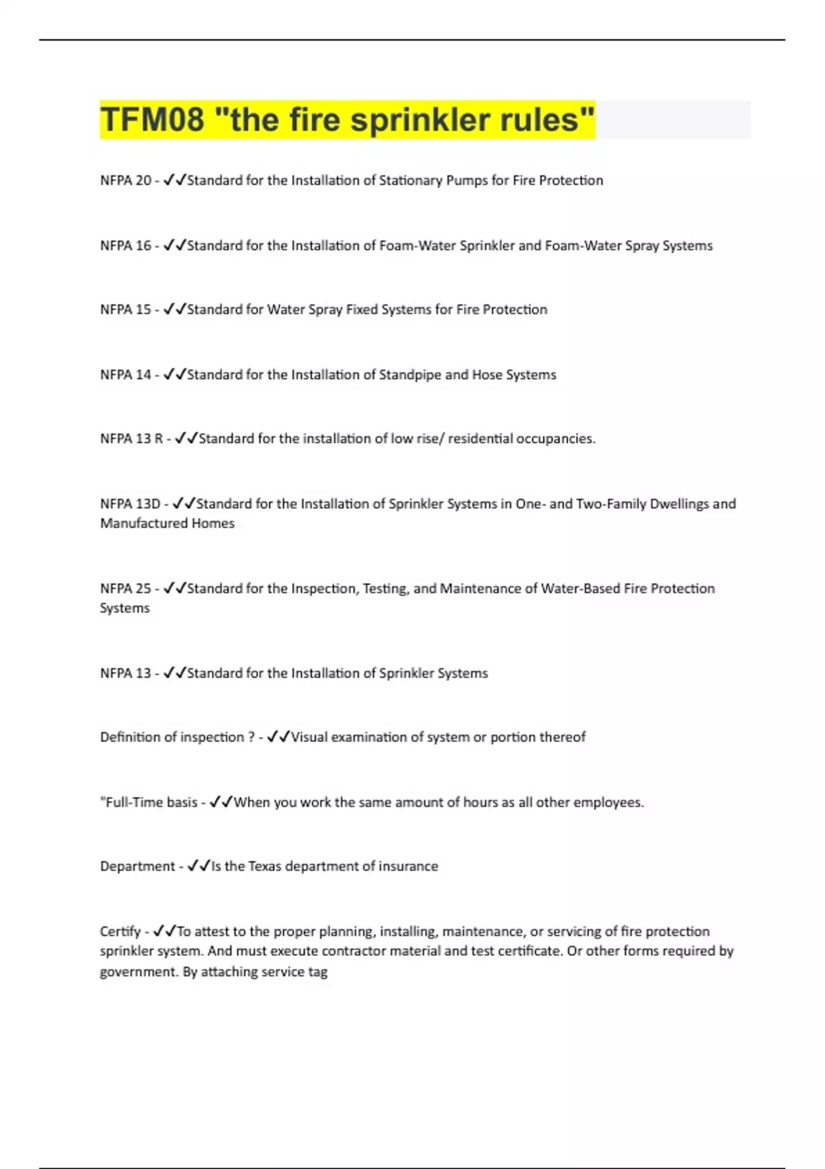 NFPA 20 - Standard for the Installation of Stationary Pumps for Fire Protection NFPA 16 - Standard for the Installation of Foam-Water Sprinkler and Foam-Water Spray Systems NFPA 15 - Standard for Water Spray Fixed Systems for Fire Protection NFPA 14 - Standard for the Installation of Standpipe and Hose Systems NFPA 13 R - Standard for the installation of low rise/ residential occupancies. NFPA 13D - Standard for the Installation of Sprinkler Systems in One- and Two-Family Dwellings and Manufactured Homes NFPA 25 - Standard for the Inspection, Testing, and Maintenance of Water-Based Fire Protection Systems NFPA 13 - Standard for the Installation of Sprinkler Systems Definition of inspection ? - Visual examination of system or portion thereof "Full-Time basis - When you work the same amount of hours as all other employees. Department - Is the Texas department of insurance Certify - To attest to the proper planning, installing, maintenance, or servicing of fire protection sprinkler system. And must execute contractor material and test certificate. Or other forms required by government. By attaching service tagCertificate - Certificate of reg