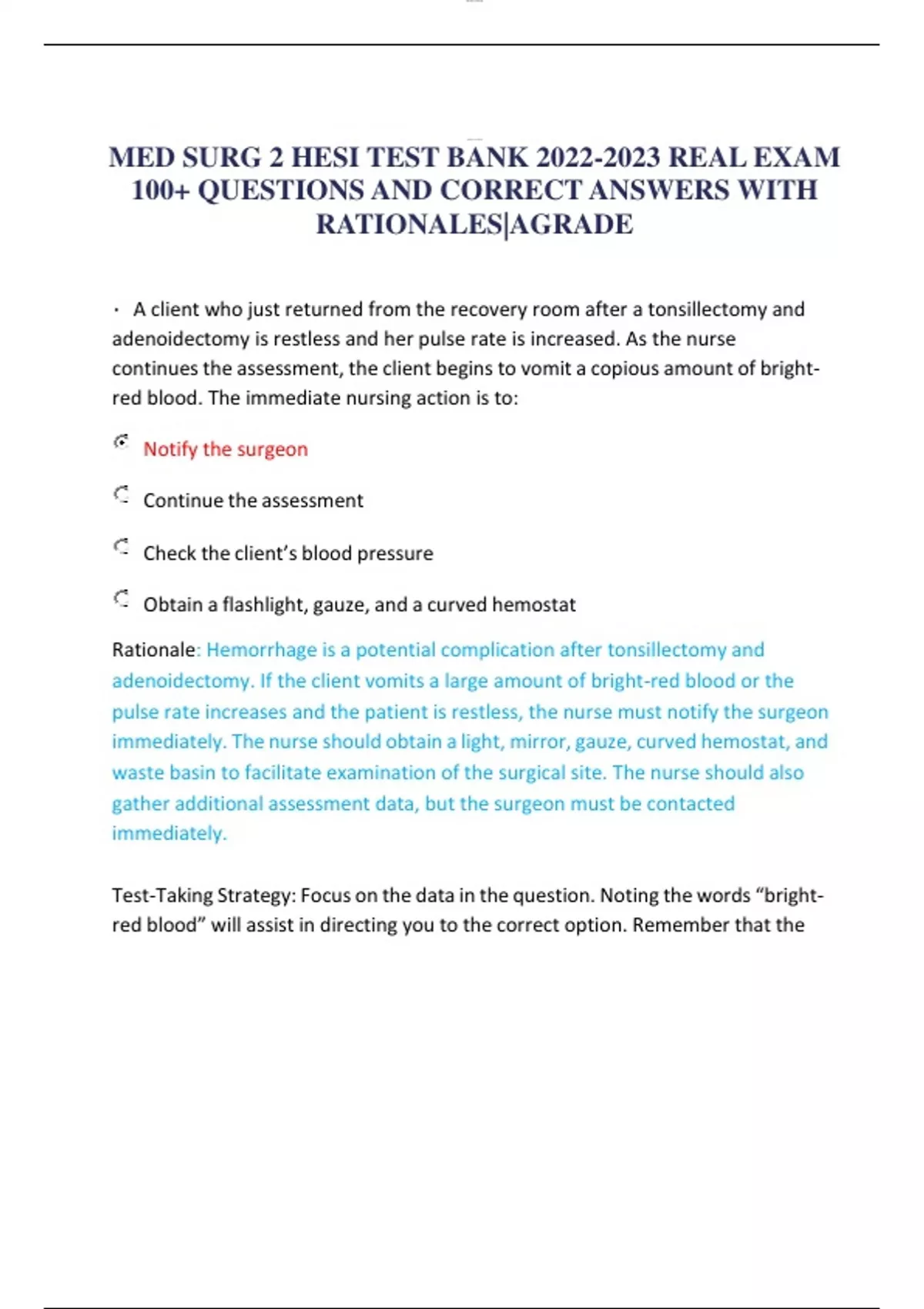 MED SURG 2 HESI TEST BANK REAL EXAM 100+ QUESTIONS AND CORRECT ANSWERS WITH RATIONALES|AGRADE