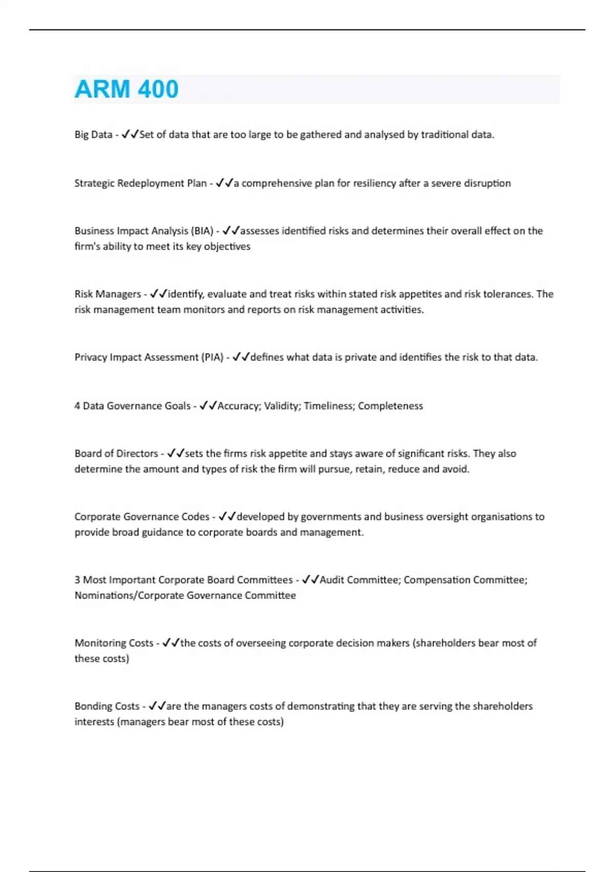 Big Data - Set of data that are too large to be gathered and analysed by traditional data. Strategic Redeployment Plan - a comprehensive plan for resiliency after a severe disruption Business Impact Analysis (BIA) - assesses identified risks and determines their overall effect on the firm's ability to meet its key objectives Risk Managers - identify, evaluate and treat risks within stated risk appetites and risk tolerances. The risk management team monitors and reports on risk management activities. Privacy Impact Assessment (PIA) - defines what data is private and identifies the risk to that data. 4 Data Governance Goals - Accuracy; Validity; Timeliness; Completeness Board of Directors - sets the firms risk appetite and stays aware of significant risks. They also determine the amount and types of risk the firm will pursue, retain, reduce and avoid. Corporate Governance Codes - developed by governments and business oversight organisations to provide broad guidance to corporate boards and management. 3 Most Important Corporate Board Committees - Audit Committee; Compensation Committee; Nominations/Corporate Governance Committee Monitoring Costs - the costs of overseeing corporate decision makers (shareholders bear most of these costs) Bonding Costs - are the managers costs of demonstrating that they are serving the shareholders interests (managers bear most of these costs)