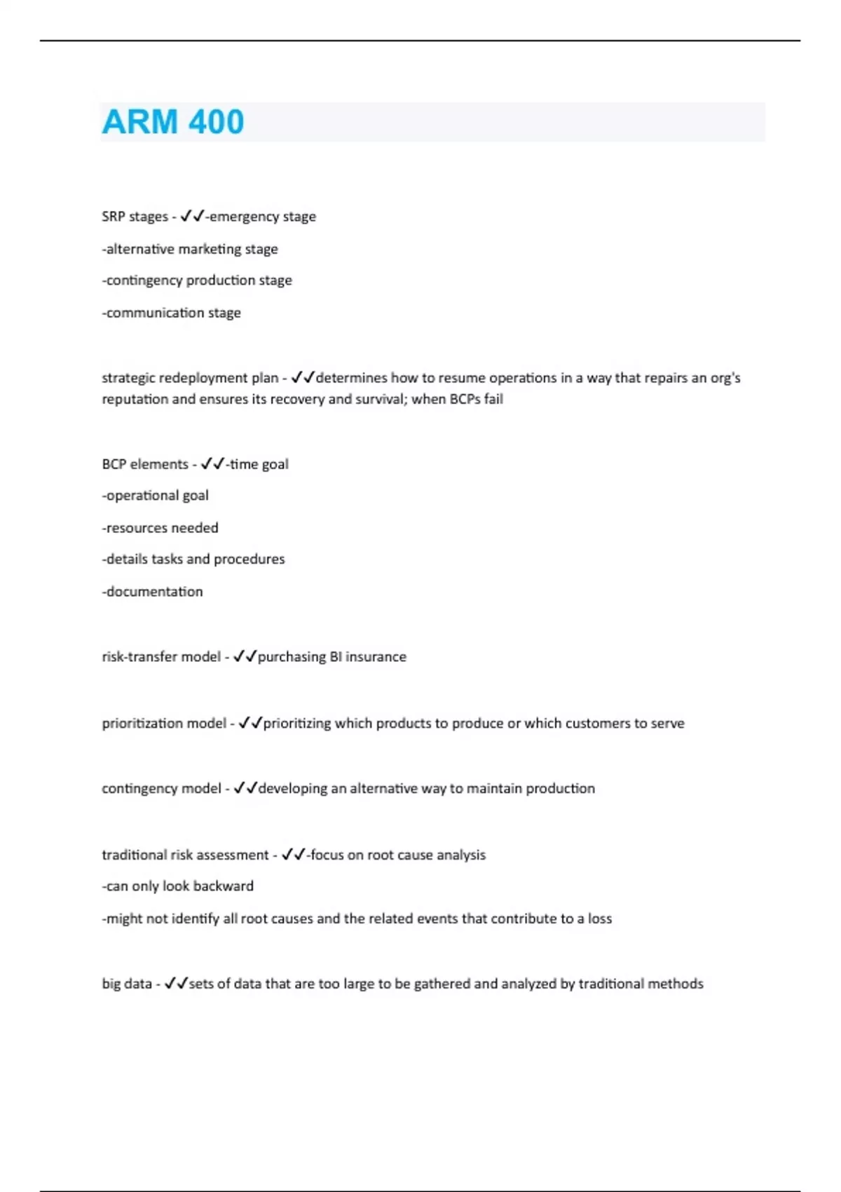 SRP stages - -emergency stage -alternative marketing stage -contingency production stage -communication stage strategic redeployment plan - determines how to resume operations in a way that repairs an org's reputation and ensures its recovery and survival; when BCPs fail BCP elements - -time goal -operational goal -resources needed -details tasks and procedures -documentation risk-transfer model - purchasing BI insurance prioritization model - prioritizing which products to produce or which customers to serve contingency model - developing an alternative way to maintain production traditional risk assessment - -focus on root cause analysis -can only look backward -might not identify all root causes and the related events that contribute to a loss big data - sets of data that are too large to be gathered and analyzed by traditional methods