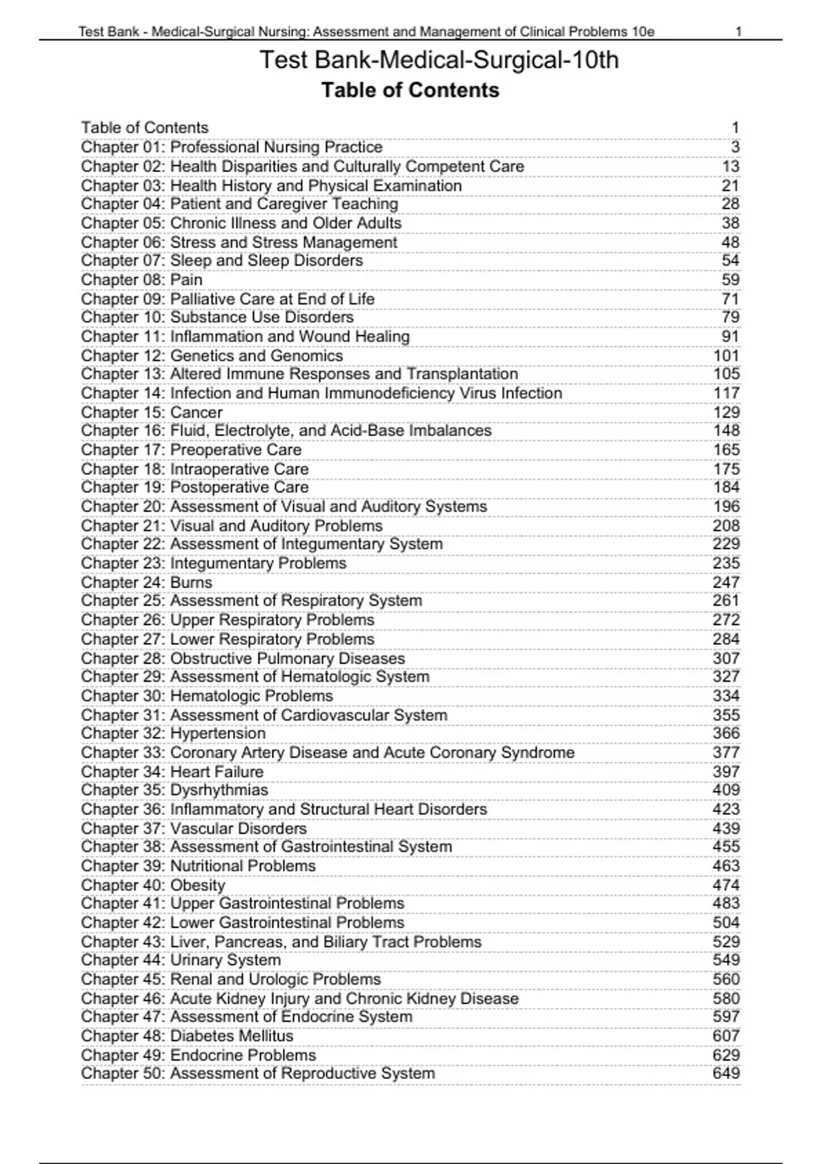 Table of Contents Table of Contents Chapter 01: Professional Nursing Practice Chapter 02: Health Disparities and Culturally Competent Care Chapter 03: Health History and Physical Examination Chapter 04: Patient and Caregiver Teaching Chapter 05: Chronic Illness and Older Adults Chapter 06: Stress and Stress Management Chapter 07: Sleep and Sleep Disorders Chapter 08: Pain Chapter 09: Palliative Care at End of Life Chapter 10: Substance Use Disorders Chapter 11: Inflammation and Wound Healing Chapter 12: Genetics and Genomics Chapter 13: Altered Immune Responses and Transplantation Chapter 14: Infection and Human Immunodeficiency Virus Infection Chapter 15: Cancer Chapter 16: Fluid, Electrolyte, and Acid-Base Imbalances Chapter 17: Preoperative Care Chapter 18: Intraoperative Care Chapter 19: Postoperative Care Chapter 20: Assessment of Visual and Auditory Systems Chapter 21: Visual and Auditory Problems Chapter 22: Assessment of Integumentary System Chapter 23: Integumentary Problems Chapter 24: Burns Chapter 25: Assessment of Respiratory System Chapter 26: Upper Respiratory Problems Chapter 27: Lower Respiratory Problems Chapter 28: Obstructive Pulmonary Diseases Chapter 29: Assessment of Hematologic System Chapter 30: Hematologic Problems Chapter 31: Assessment of Cardiovascular System Chapter 32: Hypertension Chapter 33: Coronary Artery Disease and Acute Coronary Syndrome Chapter 34: Heart Failure Chapter 35: Dysrhythmias Chapter 36: Inflammatory and Structural Heart Disorders Chapter 37: Vascular Disorders Chapter 38: Assessment of Gastrointestinal System Chapter 39: Nutritional Problems Chapter 40: Obesity Chapter 41: Upper Gastrointestinal Problems Chapter 42: Lower Gastrointestinal Problems Chapter 43: Liver, Pancreas, and Biliary Tract Problems Chapter 44: Urinary System Chapter 45: Renal and Urologic Problems Chapter 46: Acute Kidney Injury and Chronic Kidney Disease Chapter 47: Assessment of Endocrine System Chapter 48: Diabetes Mellitus Chapter 49: Endocrine Problems Chapter 50: Assessment of Reproductive System Test Bank - Medical-Surgical Nursing: Assessment and Management of Clinical Problems 10e 1 Test Bank-Medical-Surgical-10th Chapter 51: Breast Disorders Chapter 52: Sexually Transmitted Infections Chapter 53: Female Reproductive and Genital Problems Chapter 54: Male Reproductive and Genital Problems Chapter 55: Assessment of Nervous System Chapter 56: Acute Intracranial Problems Chapter 57: Stroke Chapter 58: Chronic Neurologic Problems Chapter 59: Dementia and Delirium Chapter 60: Spinal Cord and Peripheral Nerve Problems Chapter 61: Assessment of Musculoskeletal System Chapter 62: Musculoskeletal Trauma and Orthopedic Surgery Chapter 63: Musculoskeletal Problems Chapter 64: Arthritis and Connective Tissue Diseases Chapter 65: Critical Care Chapter 66: Shock, Sepsis, and Multiple Organ Dysfunction Syndrome Chapter 67: Acute Respiratory Failure and Acute Respiratory Distress Syndrome Chapter 68: Emergency and Disaster Nursing Test Bank - Medical-Surgical Nursing: Assessment and Management of Clinical Problems 10e 2 Test Bank-Medical-Surgical-10th