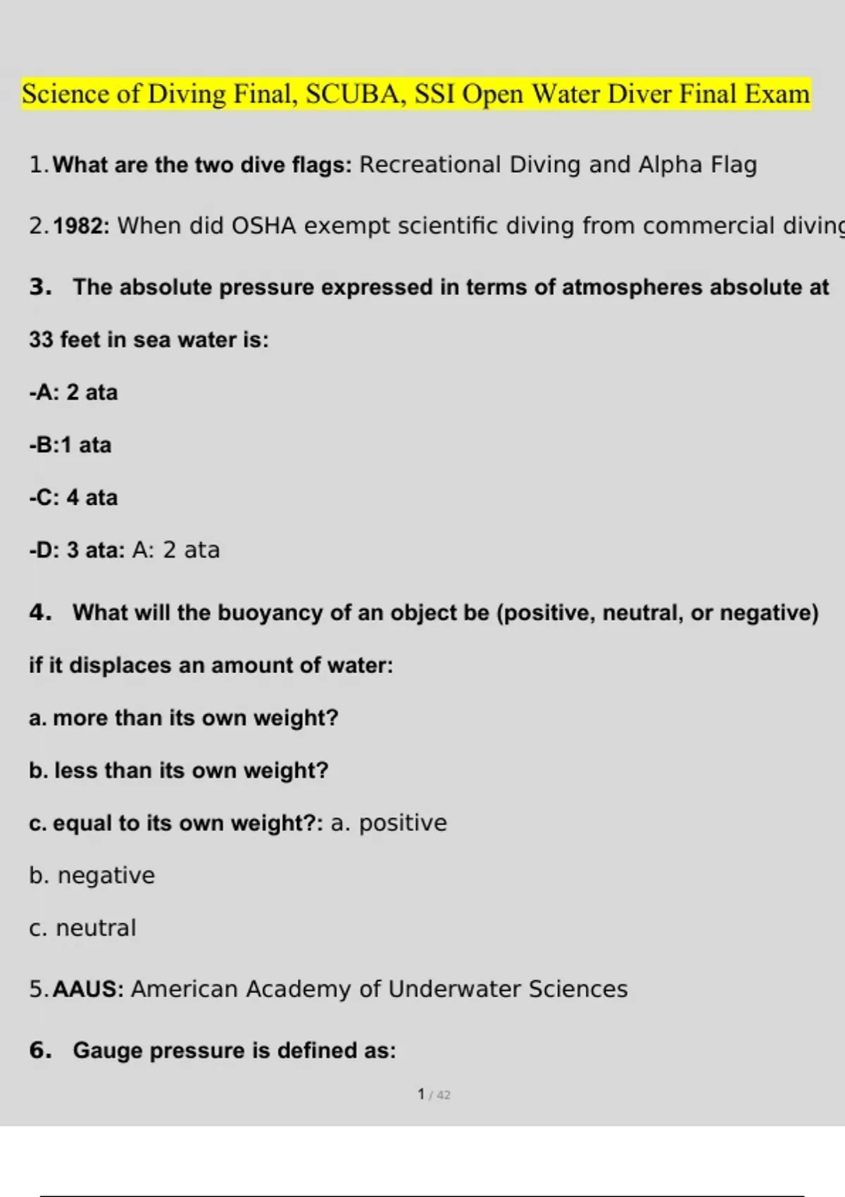 Science of Diving Final, SCUBA, SSI Open Water Diver Final Exam.